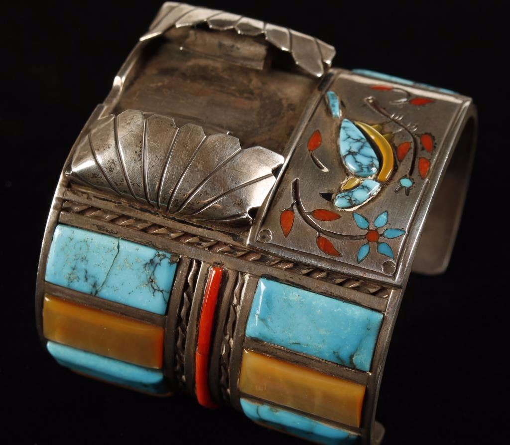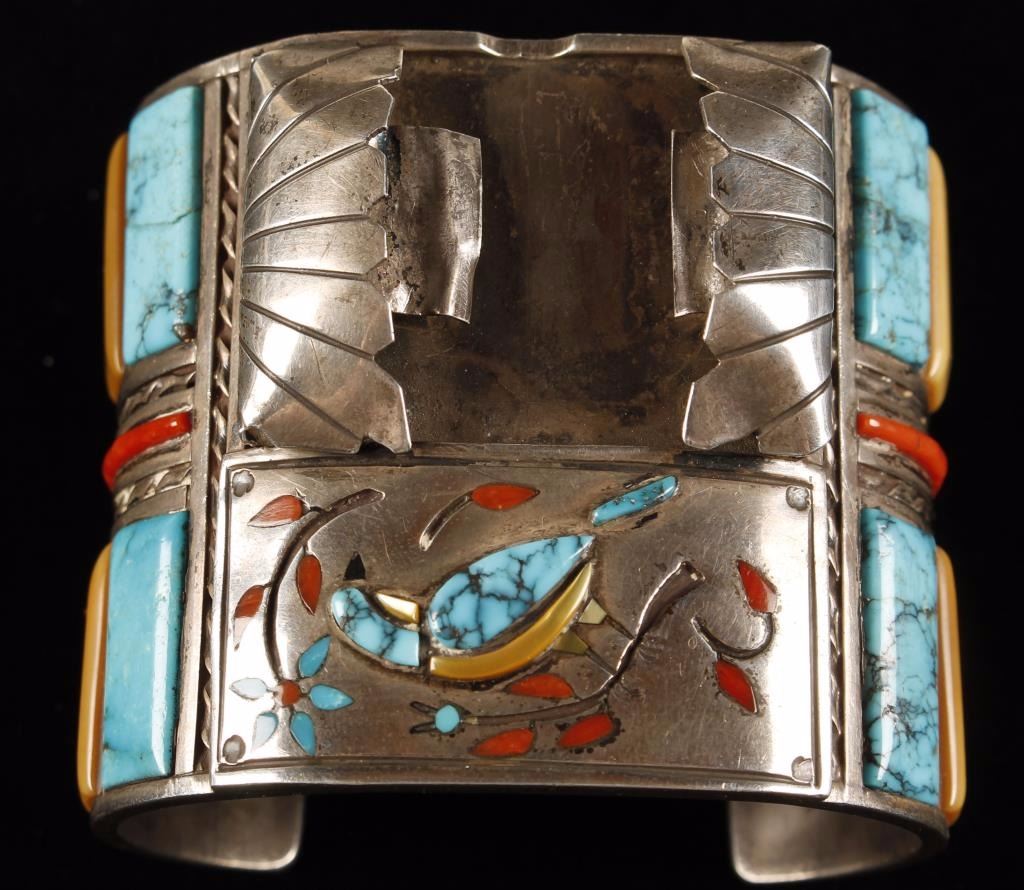 Bird inlaid design accented with turquoise, mother of pearl and coral. Signed 'W. Silvers'.