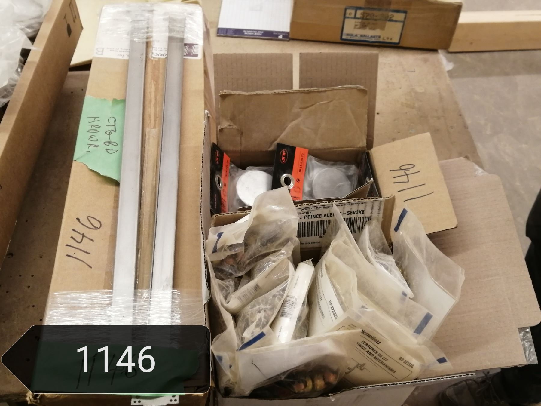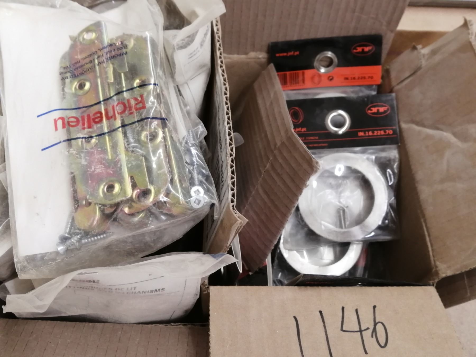 Large amount of new cutting board sliding hardware. Box of bed frame rail supports and pocket door inset pulls