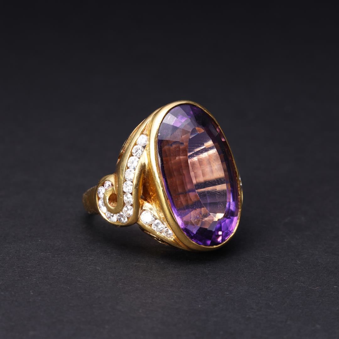 Large and Elaborate 18K Yellow Gold Amethyst & Diamond Cocktail Ring containing one oval amethyst 22.5mm x 14.5mm weighing approximately 19 cts. Thirty round brilliant weighing approximately 0.35 cts. Total weight of ring is 22 gm. Estimated retail value