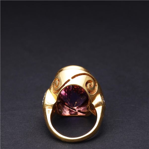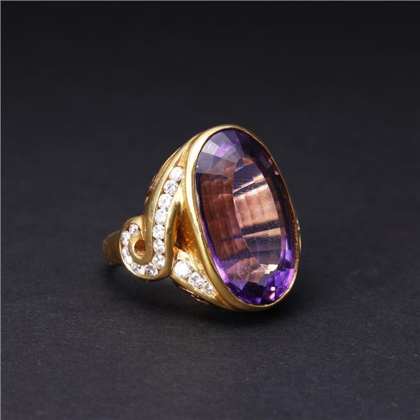 Large and Elaborate 18K Yellow Gold Amethyst & Diamond Cocktail Ring containing one oval amethyst 22... Show more..