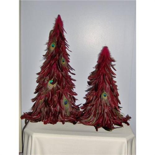 These holiday trees are simply astounding! The larger one is 25 inches tall and 8 inches wide, and the smaller one is 18 inches tall and 5 3/4 inches wide. Both are handmade of feathers dyed red and interspersed with the "eyes" of peacock feathers. They are florist quality. The colors, texture, and design all combine for a transfixing visual experience!<p>