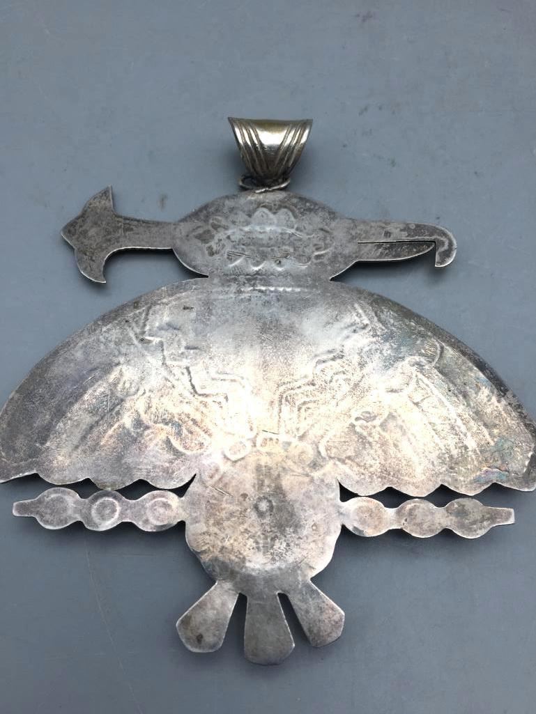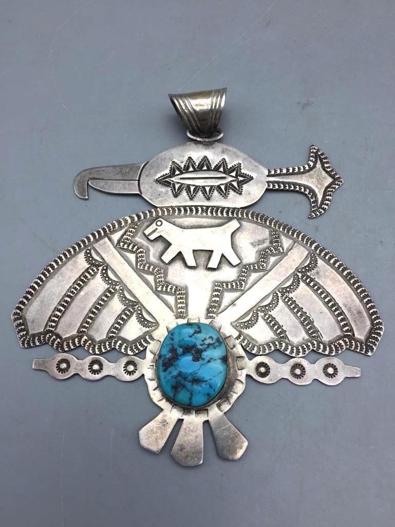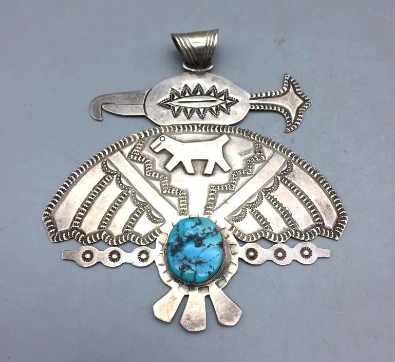 For sale in this lot is a large and unique thunderbird pendant featuring a single turquoise stone. Maker: Unmarked. Approx. Age: Modern. Size: 4-1/4" x 4". Weighs 49.8 grams. Condition: Good for its age, normal wear expected. Please look closely at the pictures - they are an important part of our description. Shipping: There will be a $5 handling / packaging fee for shipping this lot. The actual cost of postage will be added on top of that.