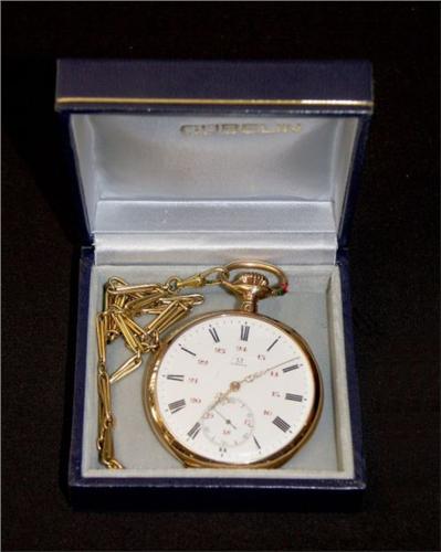 Grosse belle montre de poche en or 18 cts, signée OMEGA, cadran en émail blanc avec chiffres romains, petite seconde à 6 heures, échappement à ancre, balancier bimétallique, en très bon état, avec sa chaîne en or 24 gr, vers 1900