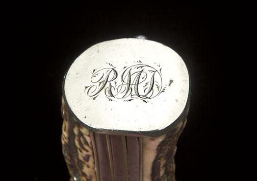 Large and unusual three-bladed knife in a pruning pattern, marked “Fouracres” on the ricasso and “Exter”, probably a London retailer. Approx. 5-3/4” overall (closed) with a 3-1/2” pruning blade, a 4-1/2”timberscribe, and a 4-3/8” saw blade. Shows beautifully grained stag scales with six German silver pins and German silver pommel cap with script initials. German silver bolsters with brass liners. All the bladeshave a half-stop and snap properly. The timberscribe blade is slow and would benefit from a minor oiling. Hugh Hayes Collection. Est: $400 - $800.