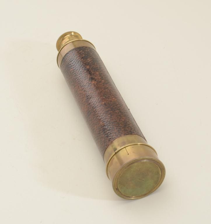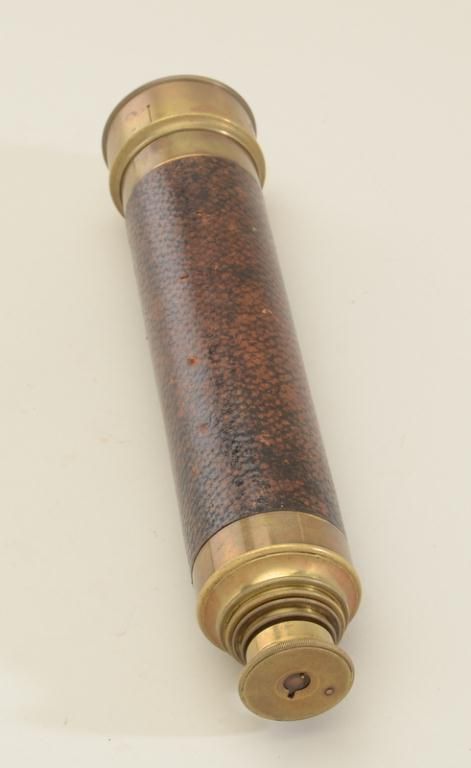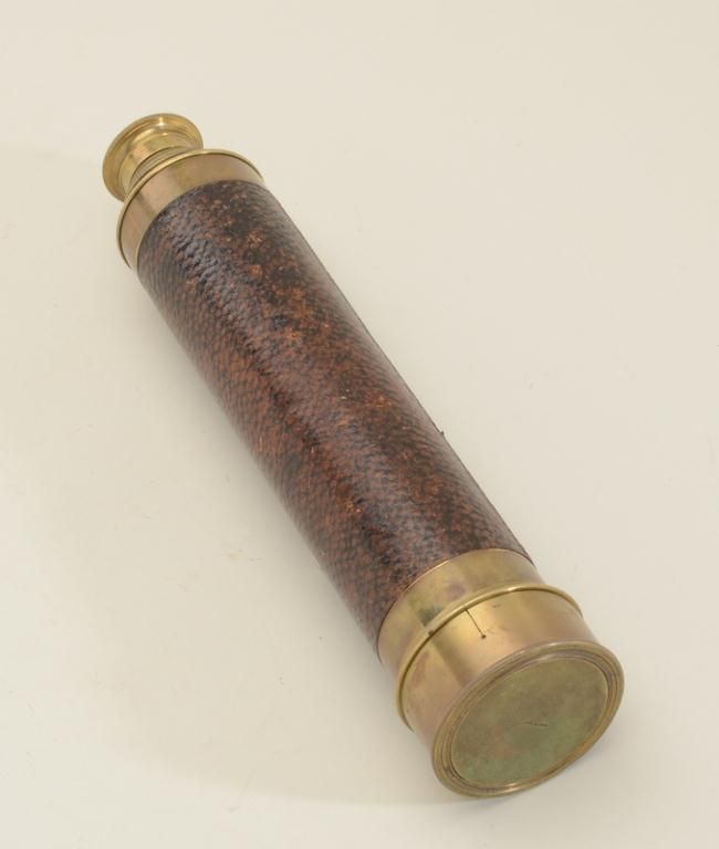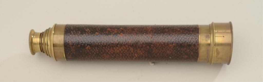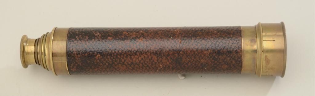 Large antique French adjustable brass spyglass with leather wrapping and brass end cap in overall very good condition, approx. 13” overall in closed position. Est.: $250-$500.