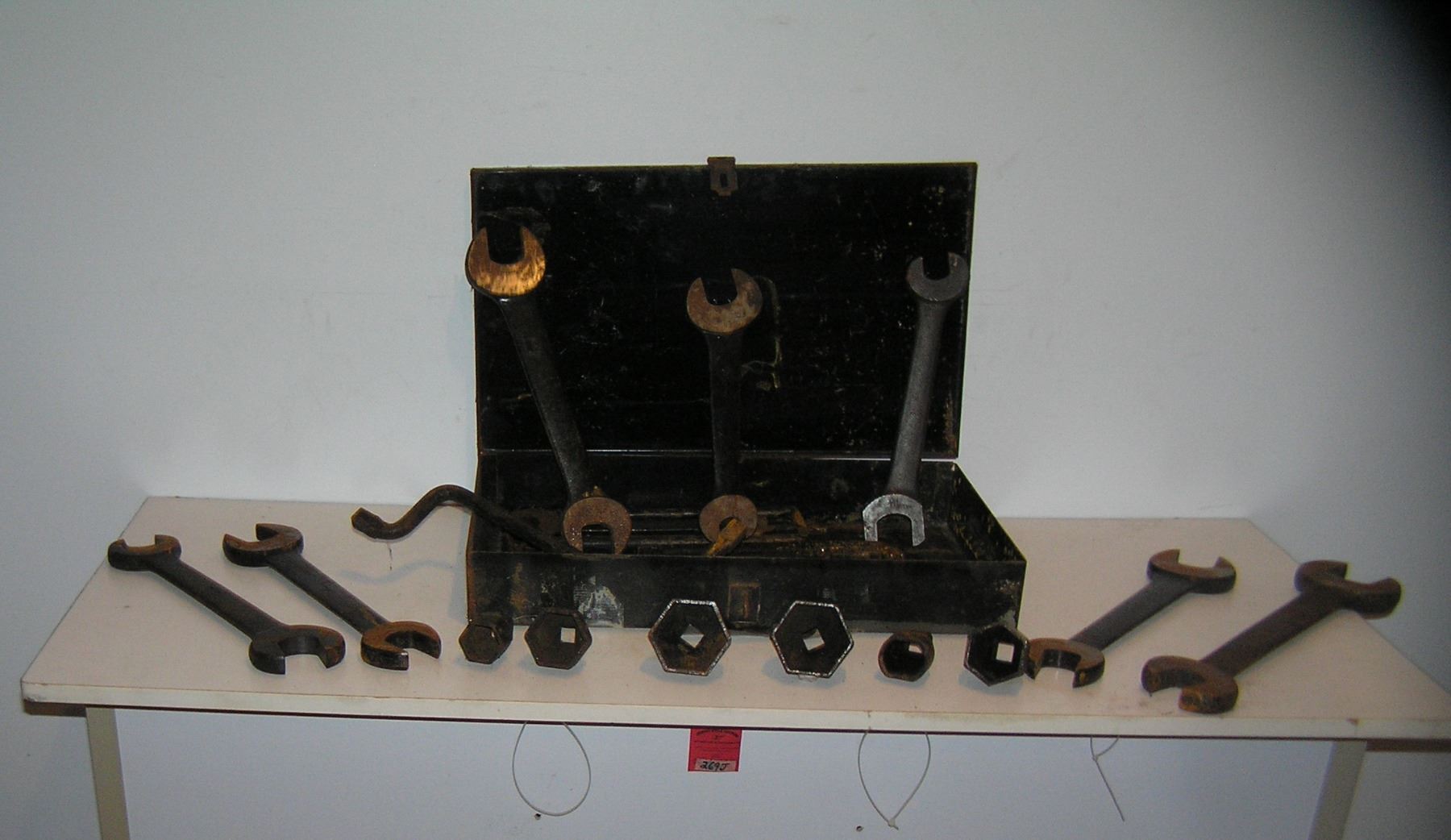 Large antique William's tool set consists of open end wrenches, sockets, socket handles, a great early signed Otis tool box and more circa 1930's est. value $300.00-$325.00