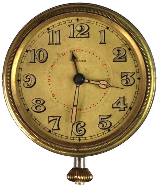 Large antique car watch marked on the inside Meylan Co. 11 jewels 2 adjustments Swiss, front marked 8 Days, watch winds but does not run, 2 1/2" diameter.