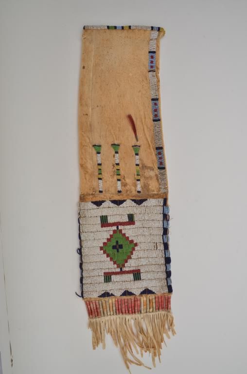 Large beaded and quilled American Indian pipe bag from Plains Indian tribes probably Sioux. The condition is good with some normal fading, small losses and aging. Measures 26”x7” Circa about 1890 to 1920. Est.: $1,400 -$2,800.