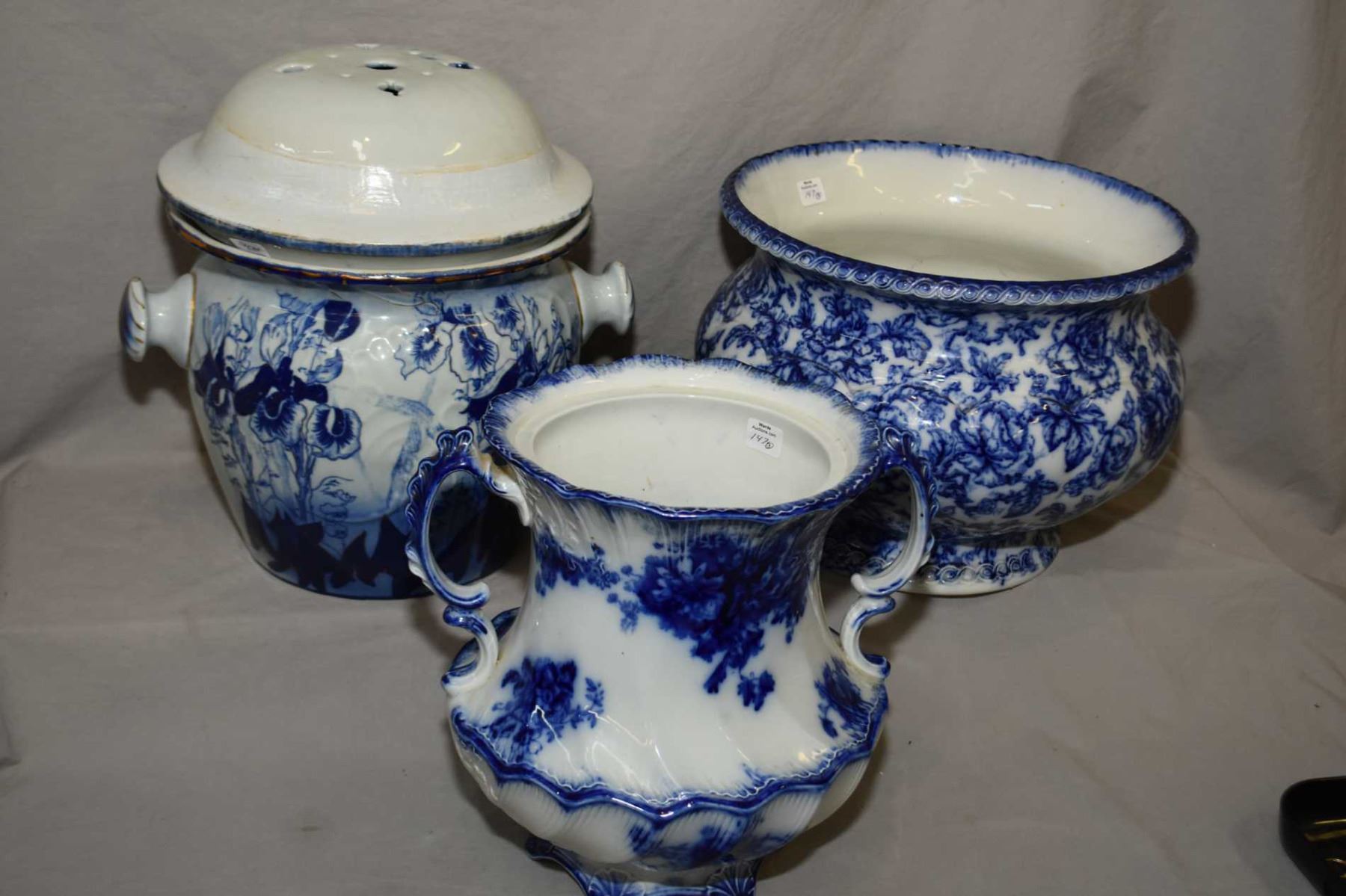 This Lot Will Not Be Shipped. Local Bidders Only. Large blue and white glazed pottery jardinere marked Losol Ware Cavendish 10" in height, an English made two piece pot and a double handled pot sans lids, note hairline crack