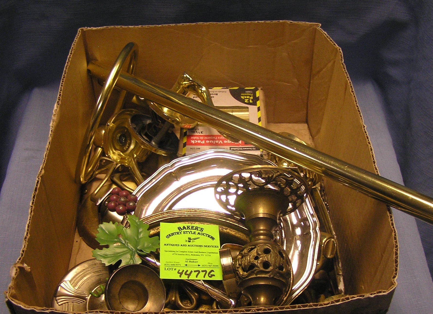 Large box full of vintage silverplate, brassware including many sets of brass hinges, accessories and more est. value $100-$125.00