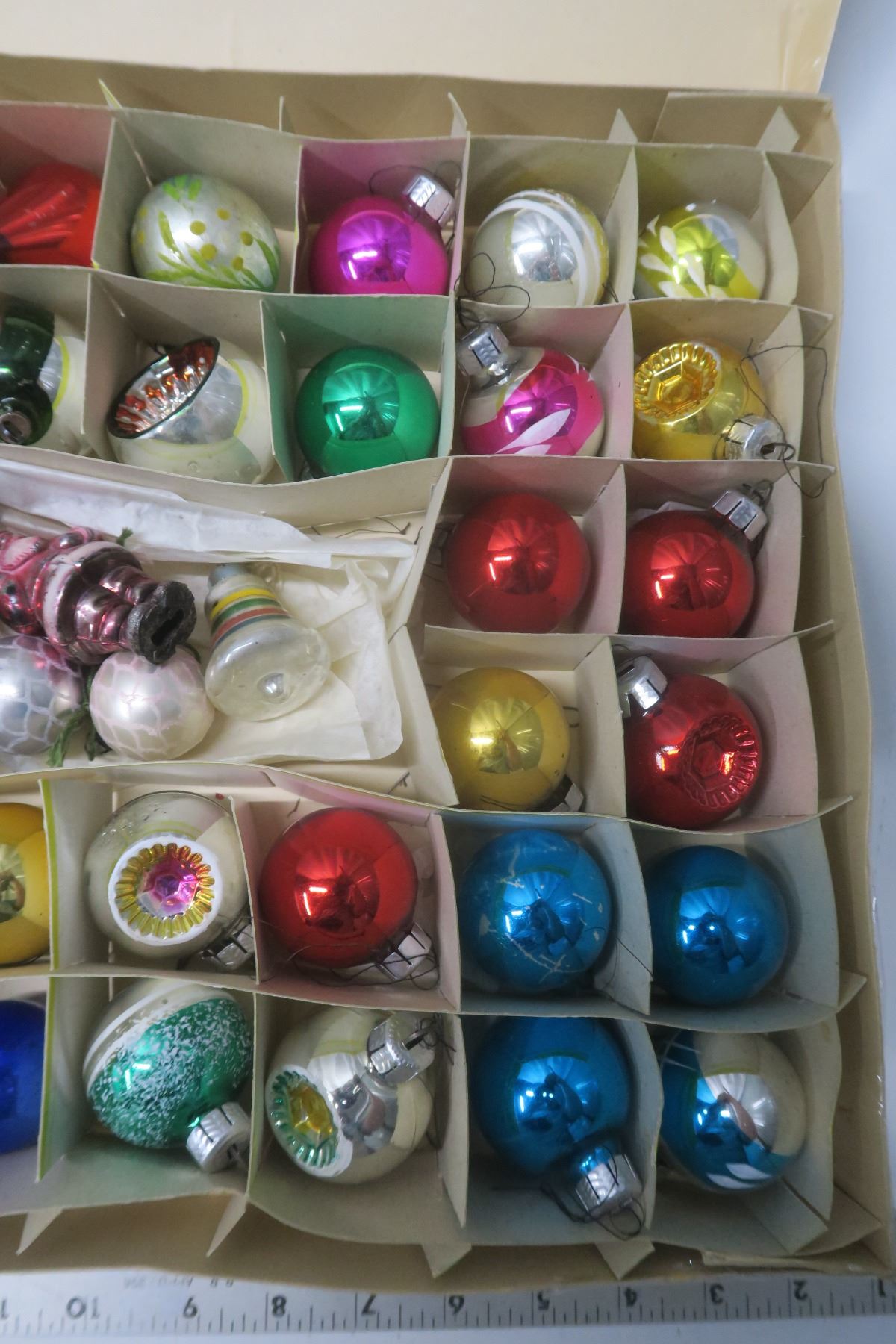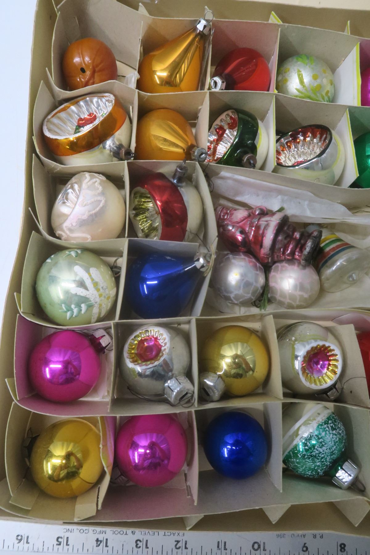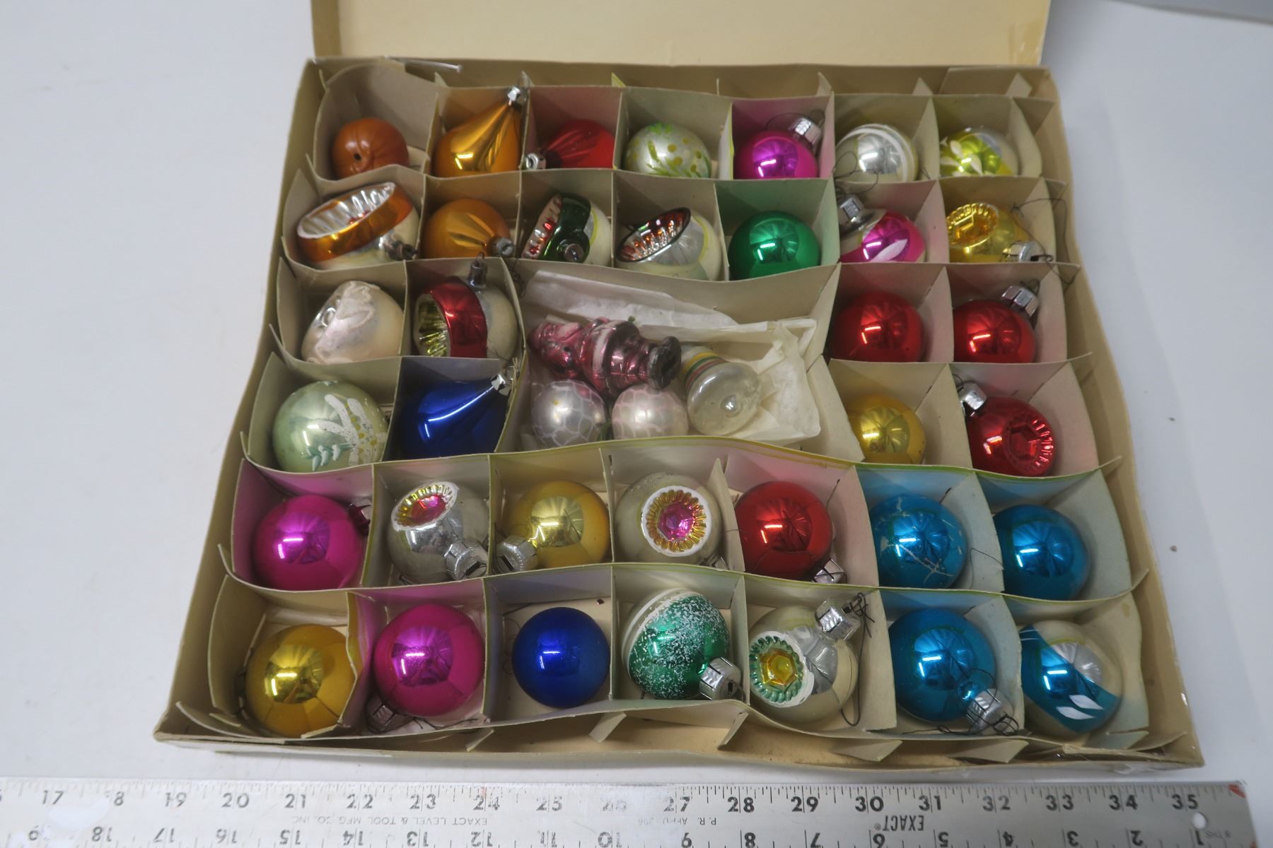 Large box of 39 Christmas ornaments - some vintage