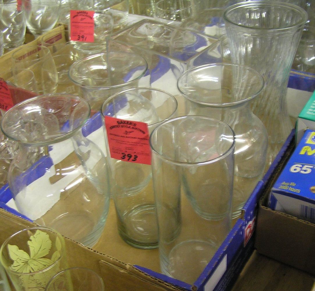 Large box of glass and crystal flower vases est. value $50.00-$60.00