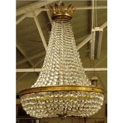 Large brass and cut glass chandelier with acanthus leaf mouldings of flared shaped with bag shaped bottom, approximately 130cm high