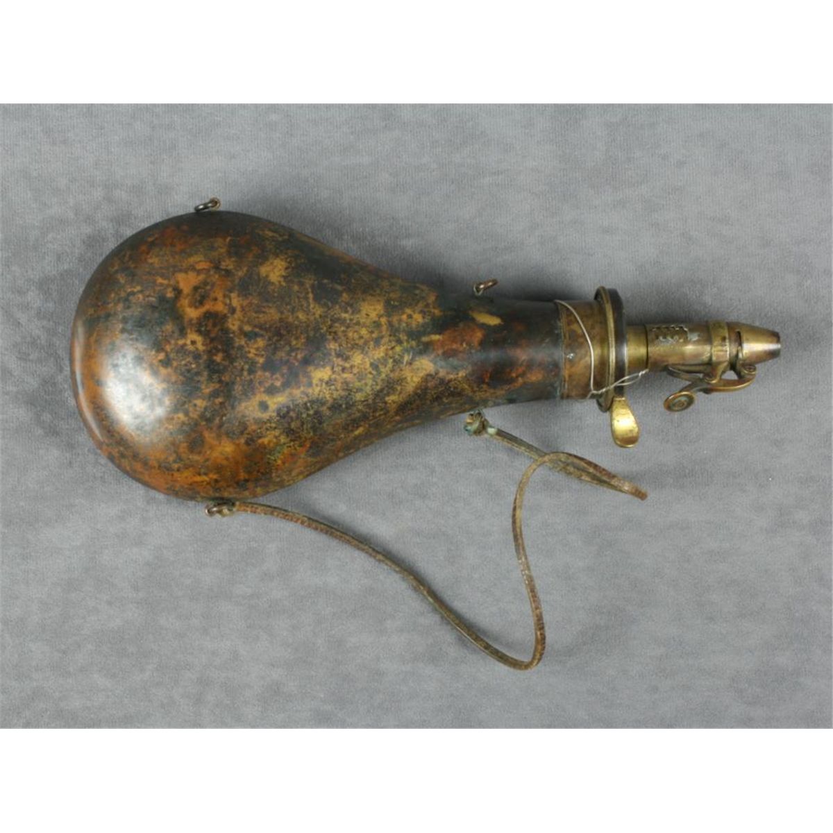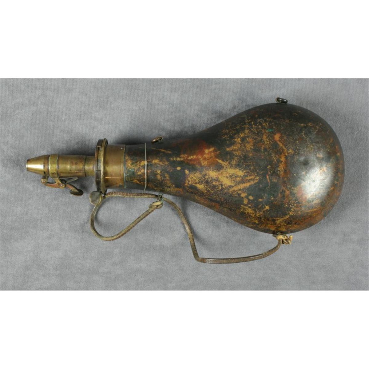Large brass powder flask with elongated charger approx. 11” overall by Am. Flask & Cap. Co. showing a dark patina with leather hanging strap. Est.: $100-$200.