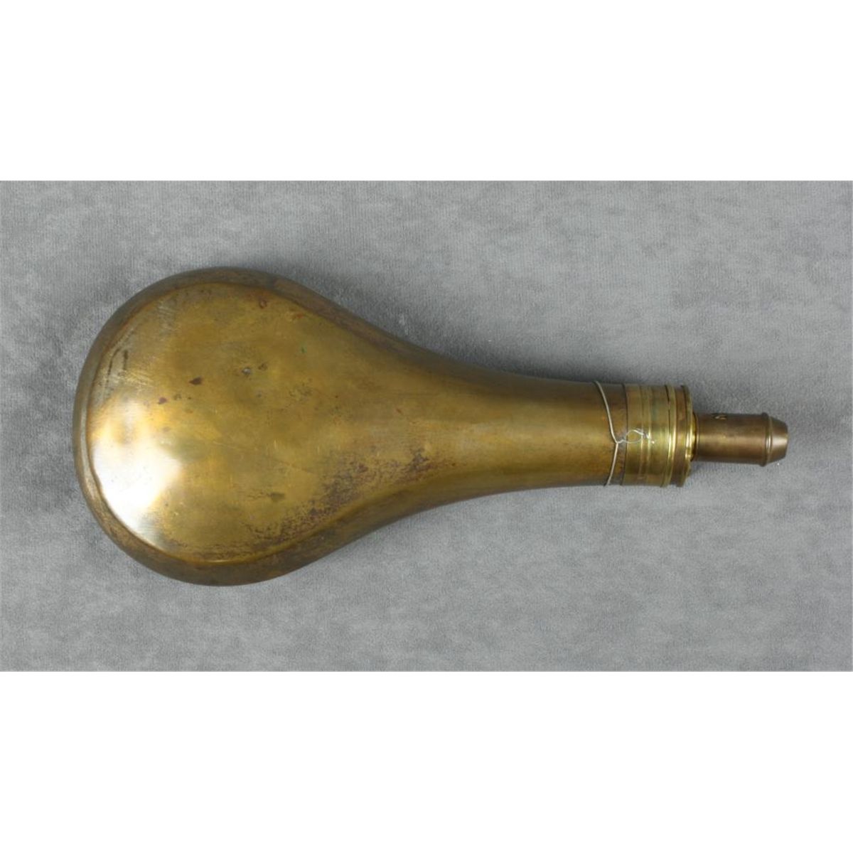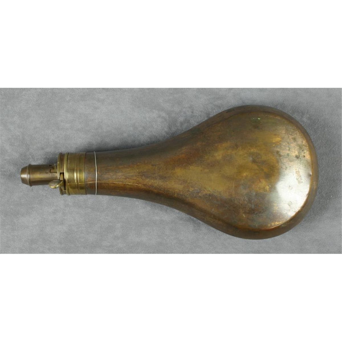 Large brass shotgun flask by Am. Flask & Cap Co. approx. 11” overall with graduated charger, nice patina with some scattered old dents. Est.: $100-$200.