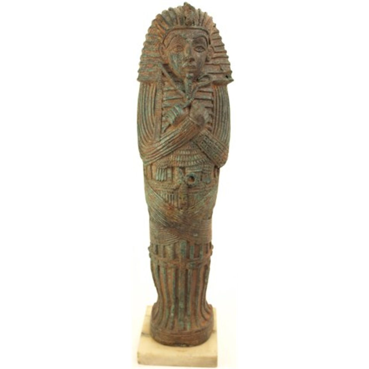 Large bronze figure of King Tut 19" tall on marble base. Includes letters to the deceased owner dated 1968 from early antiquities dealer Susette Khayat of New York who owned Ancient Art Gallery. While the leters don not describe this item they have been with it through out the time the family has owned it and is presumed that it was purchased from her galler. The statue shows no markings, green overall patina with areas of rust brown. Condition good with no repairs or damage.