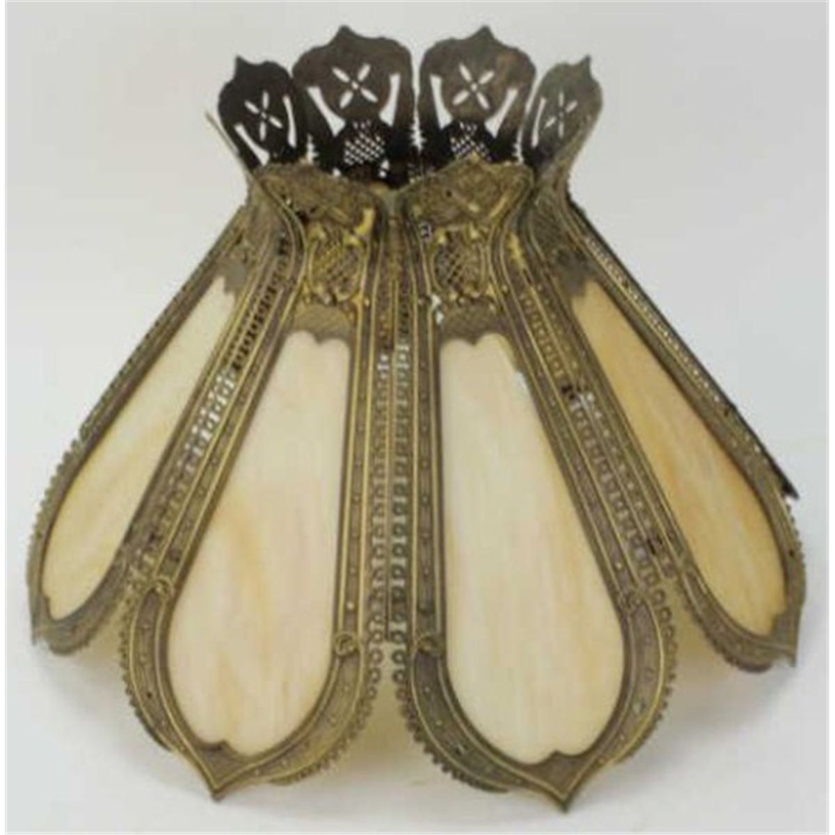 Large caramel slag glass lamp shade with finely detailed cast brass framework, unmarked, 13" tall X