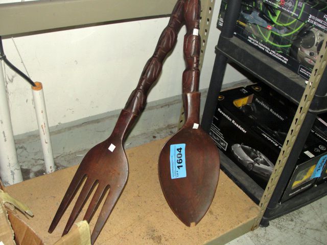 Large carved wooden fork and spoon set