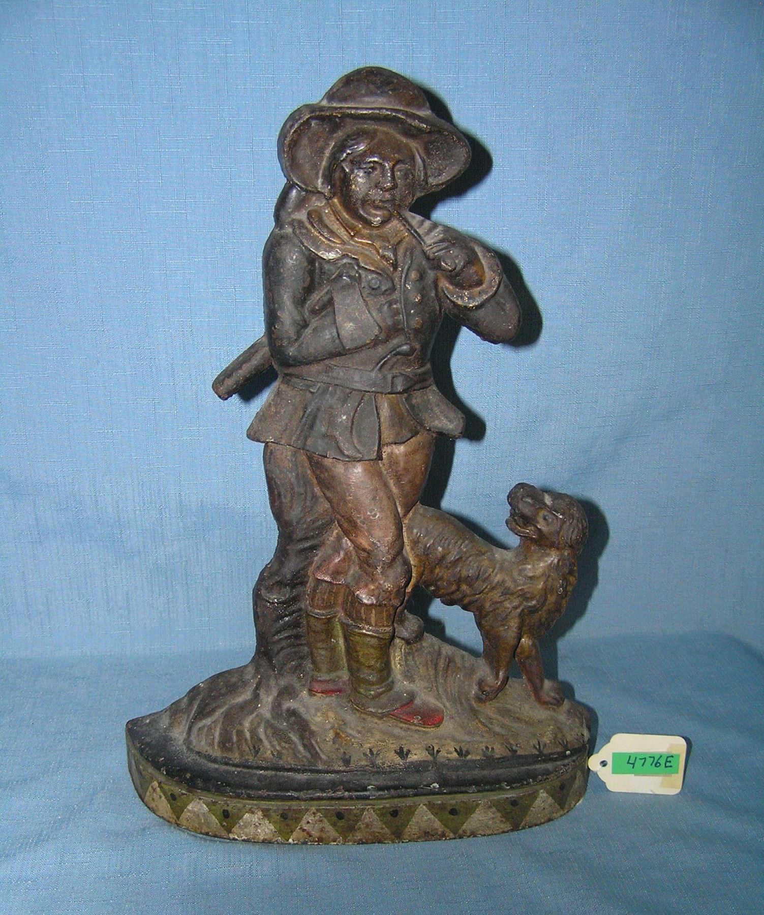 Large cast iron woodsman with axe and smoking pipe accompanied by his dog early 1900s est. value $1100.00-$1200.00
