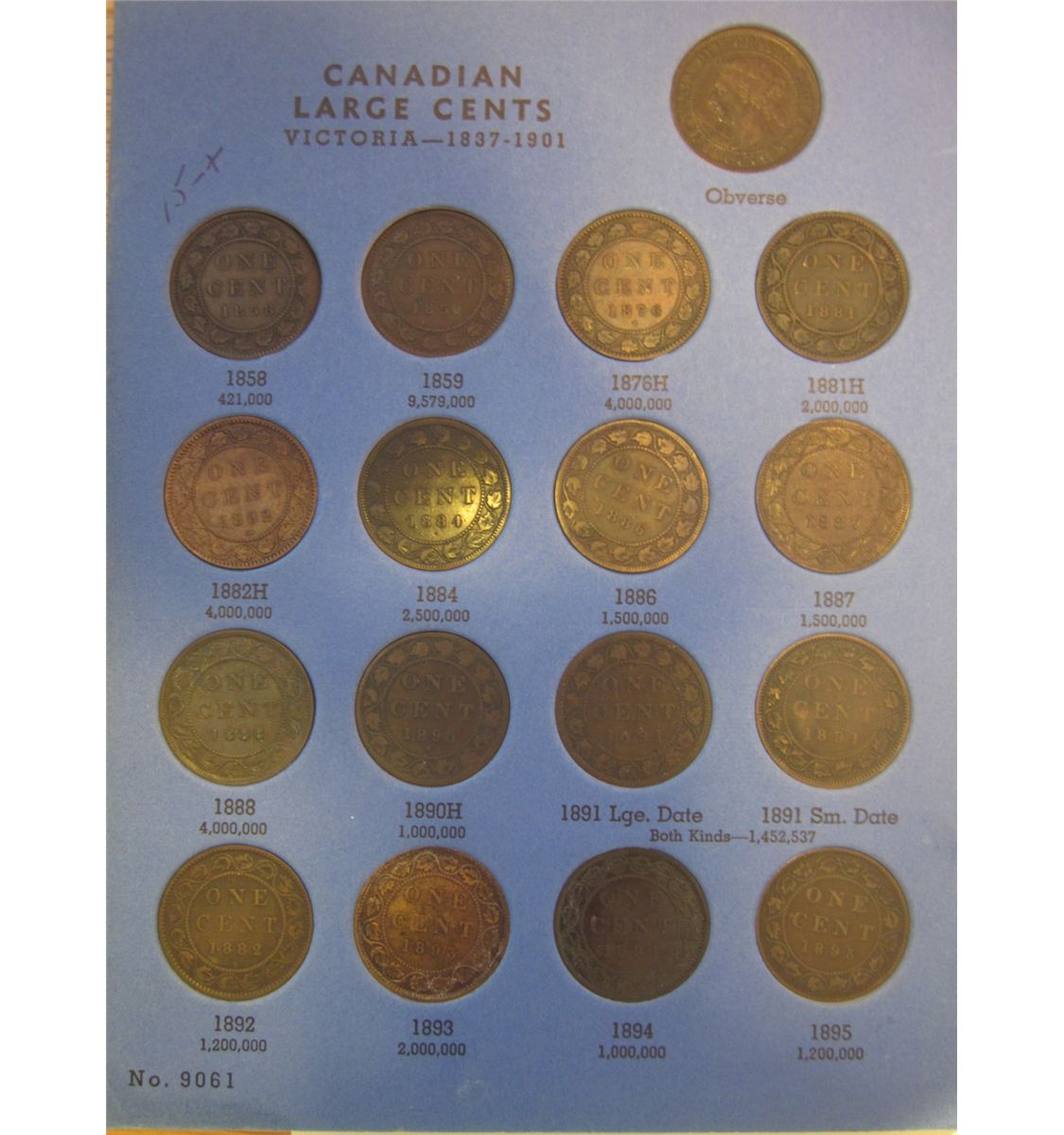 Large cent lot; 1858 to 1920 inclusively including 3 extras for obverses, small & large date 1891, both 1900 & 1907, condition VG to VF Some lacquered, some with corrosion, to be viewed. Lot of 46 coins.