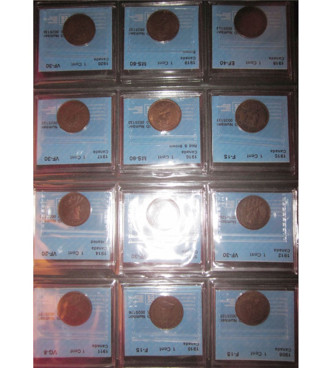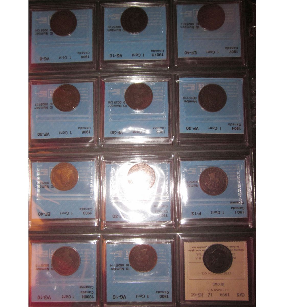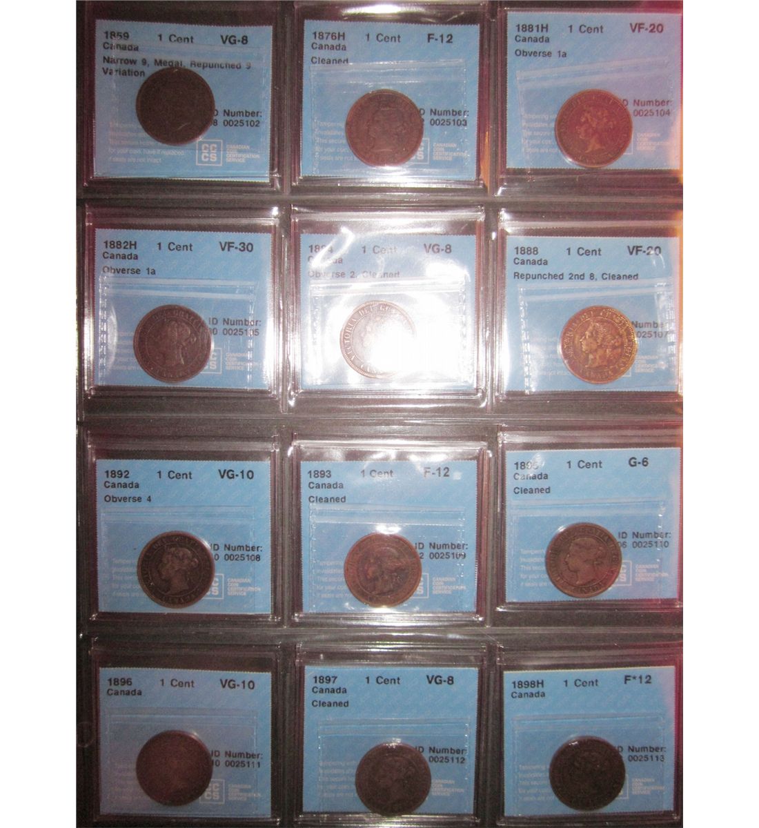 Large cent lot; all coins certified by CCCS except 1899 by ICCS; 1859 VG-8; N9 Medal Rep 9 Variation, 1876H F-12; Cleaned, 1881H VF-20; Obverse 1a, 1882H VF-30; Obverse 1a, 1884 VG-8; Obverse 2 Cleaned, 1888 VF-20; Rep 2nd8 Cleaned, 1892 VG-10; Obverse 4, 1893 F-12; Cleaned, 1895 G-6; Cleaned, 1896 VG-10, 1897 VG-8; Cleaned, 1898H F-12, 1899 MS-60; Brown, 1900 VG-10, 1900H VG-10; Cleaned, 1901 F-12 Cleaned, 1902 VF-20; Cleaned, 1903 EF-40, 1904 VF-30, 1905 VF-30, 1906 VF-30, 1907 EF-40, 1907H VG-10, 1908 VG-8, 1909 F-15, 1910 F-15, 1911 VG-8, 1912 VF-30, 1913 VF-30, 1914 VF-20; Cleaned, 1915 F-15, 1916 MS060; R&B, 1917 VF-30, 1918 EF-40, 1919 MS-60; Brown, 1920 VF-30. Lot of 36