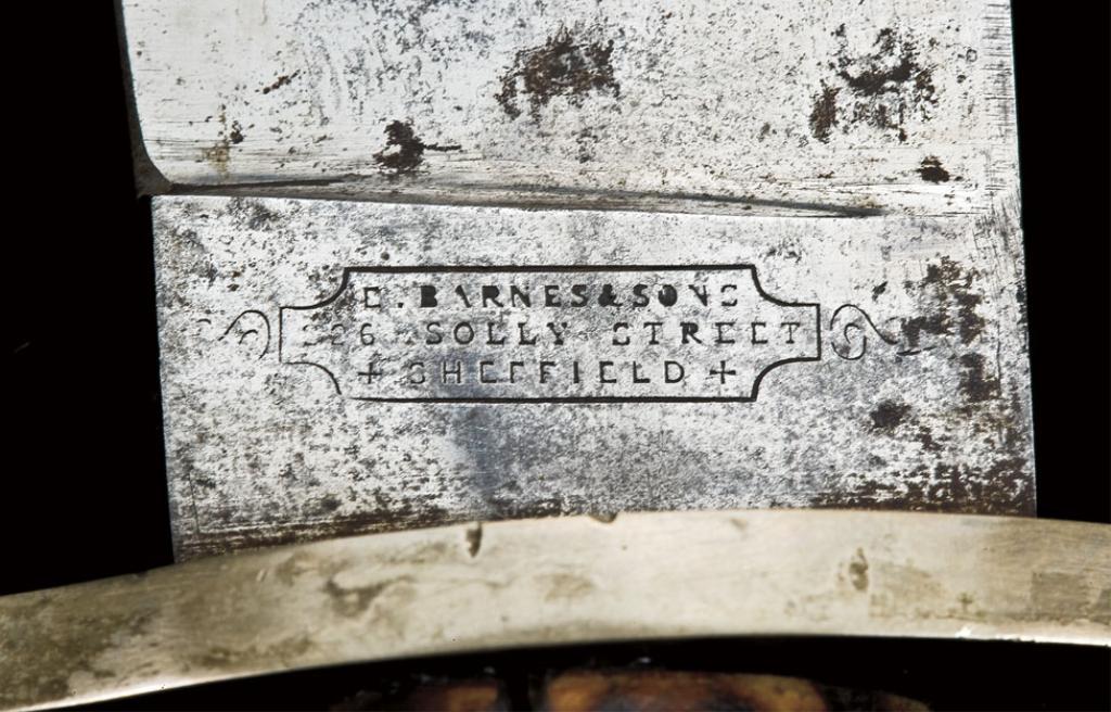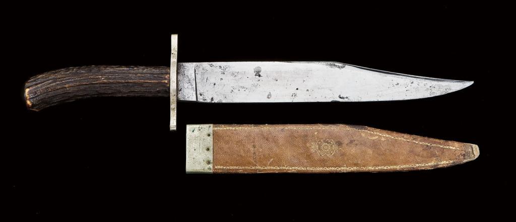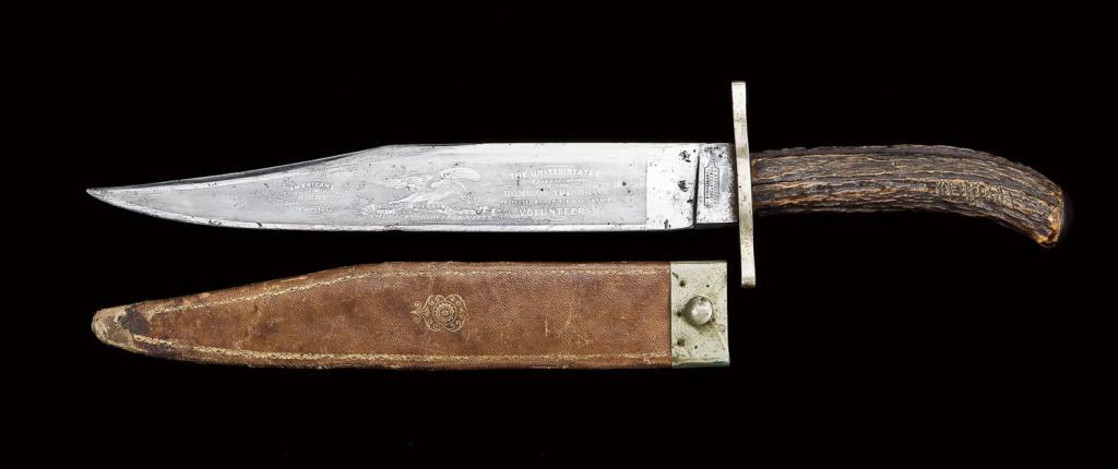 Large clip point Bowie knife by Barnes and Son Sheffield, with five etched blade and original scabbard, missing tip. Knife measures approx 16-1/2” overall , 11” blade with false edge. Blade of heavy stock,approx. 5/16”, and shows original polish in near fine original condition with slight staining, minor aging, and one indention on the blade edge with very slight tipping. Panel etching shows American eagle, AmericanBowie Knife, patriotic slogans, and motifs along with the name Edward Barnes in riband. The etching is 90-95% intact and near fine also. Heavy duty German silver crossguard with one-piece stag hilt and iron pommel cap. Several battle notches carved in hilt. Original scabbard with gold embossing, minus tip, in good to very good condition. Some natural aging overall but generally very good overall with an exceptional and impressiveblade. Circa approx 1850. Hugh Hayes Collection. Est: $4,000 - $8,000