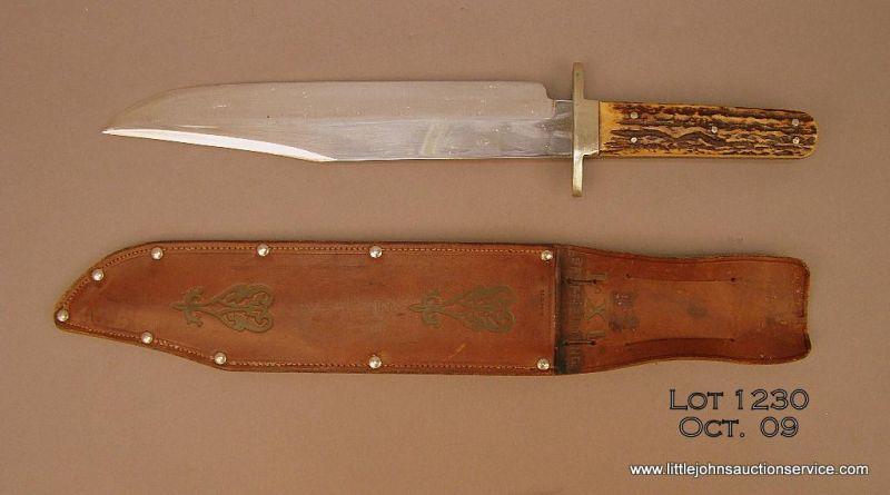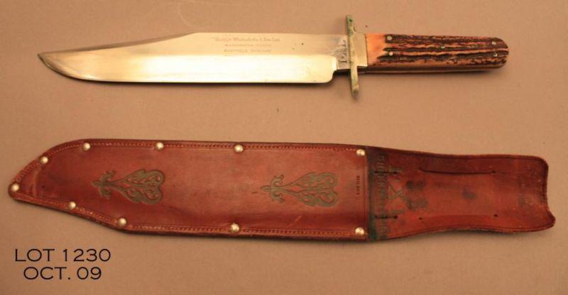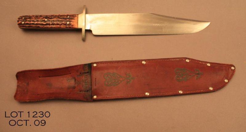 Large clip point bowie knife marked “I*XL” with leather scabbard marked “I*XL, Sheffield, Eng”. The knife is approx. 15” overall with a 10” blade that is also marked “George Wostenholm & Son Ltd., Washington Works, Sheffield England”, in overallvery good condition with thick stag grips that are attached by five pins. The scabbard is in overall very good condition. We would estimate the age of this outfit to be circa 1960’s-1970’s. A really nice massive bowie. Est.: $500-$750.