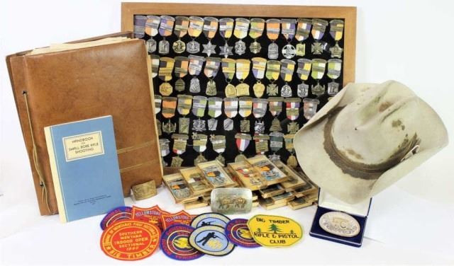 Large collection of Montana shooting medalsfrom 1950s to 1960s, having belonged to Teddy Thompson (1921-2003) Big Timber, Montana, rancher and outfitter, collection includes 75 medals, scrap book, patches, Stetson hat and belt buckles, 52 of the medals nicelyframed. Est. 400-800