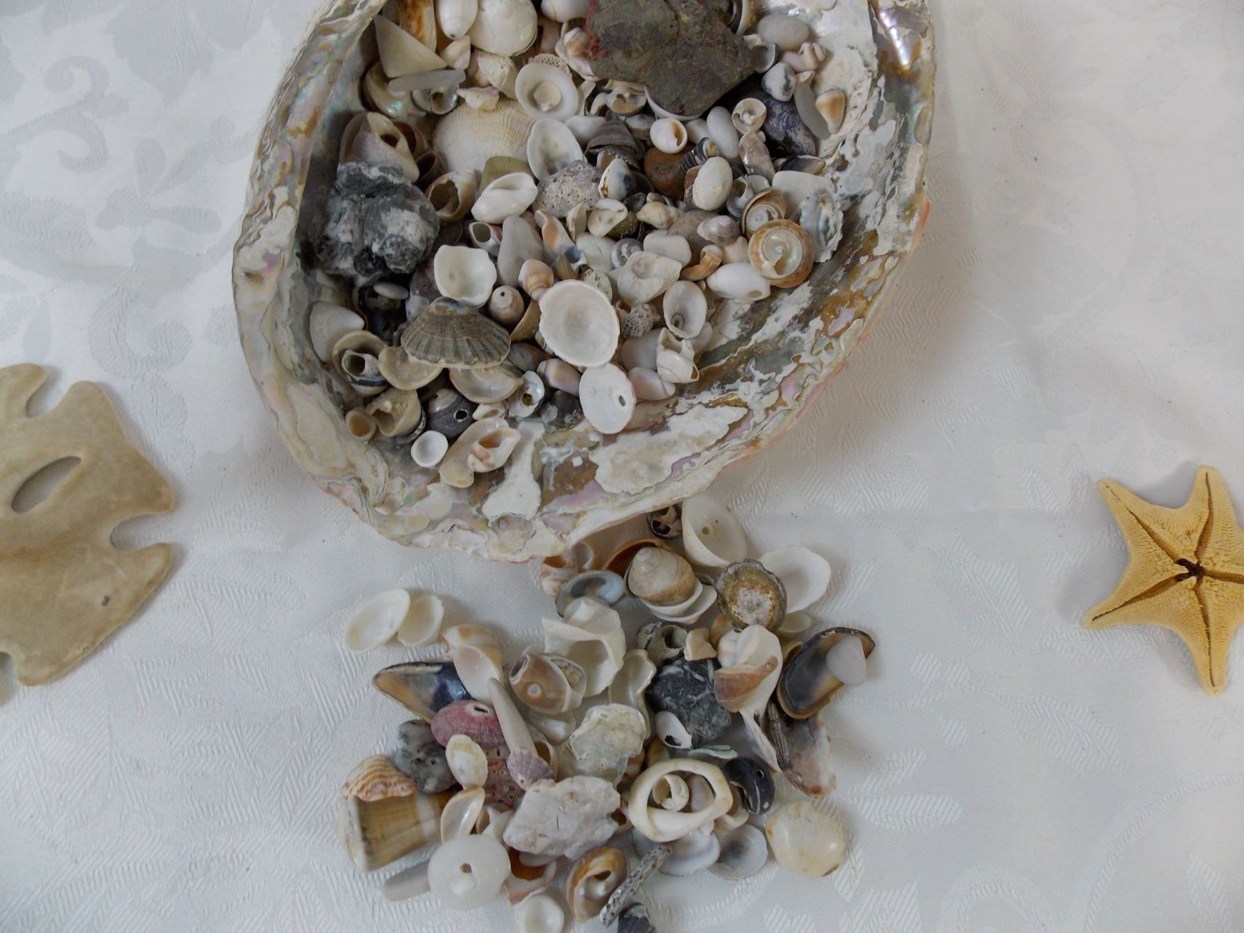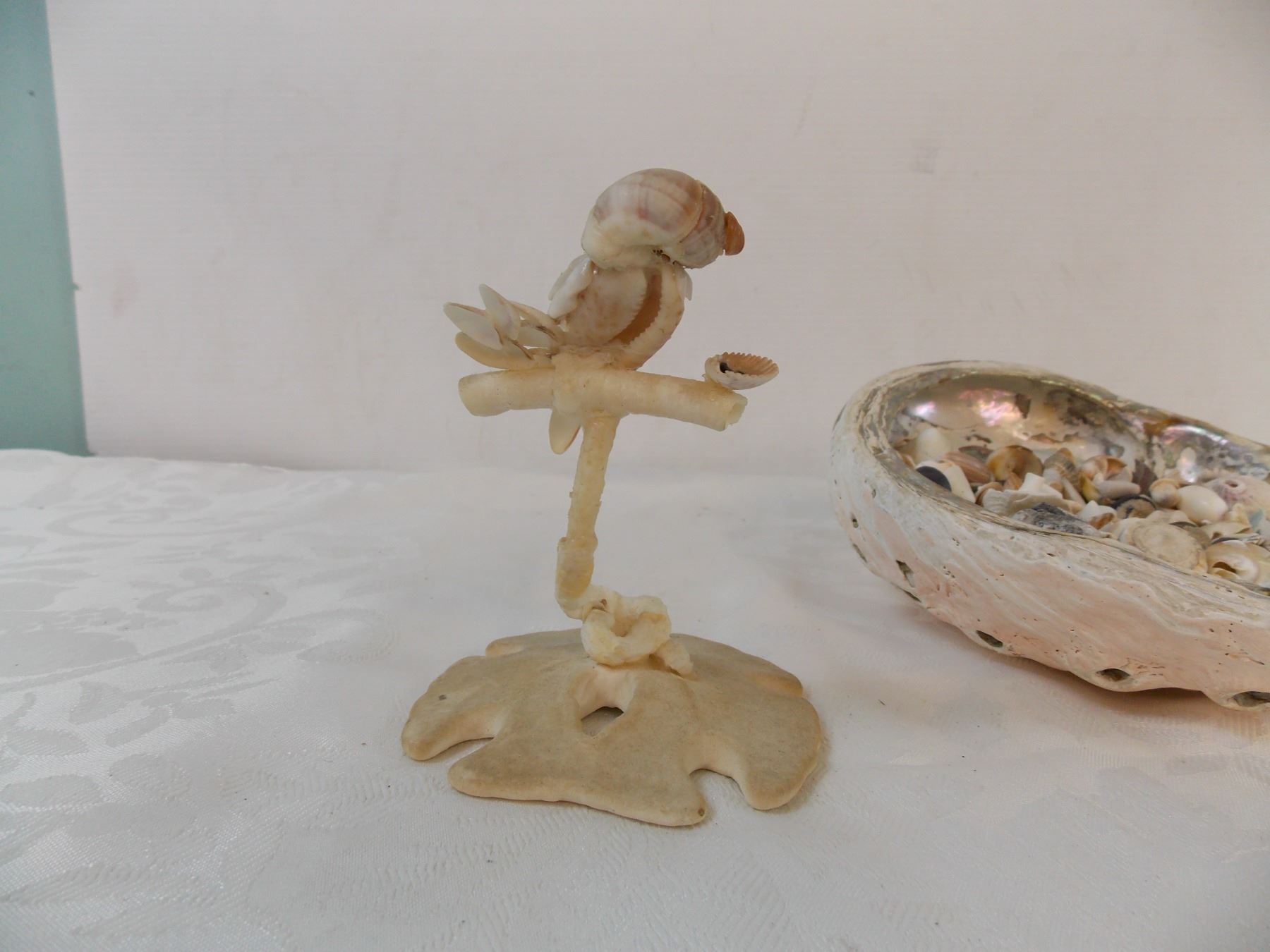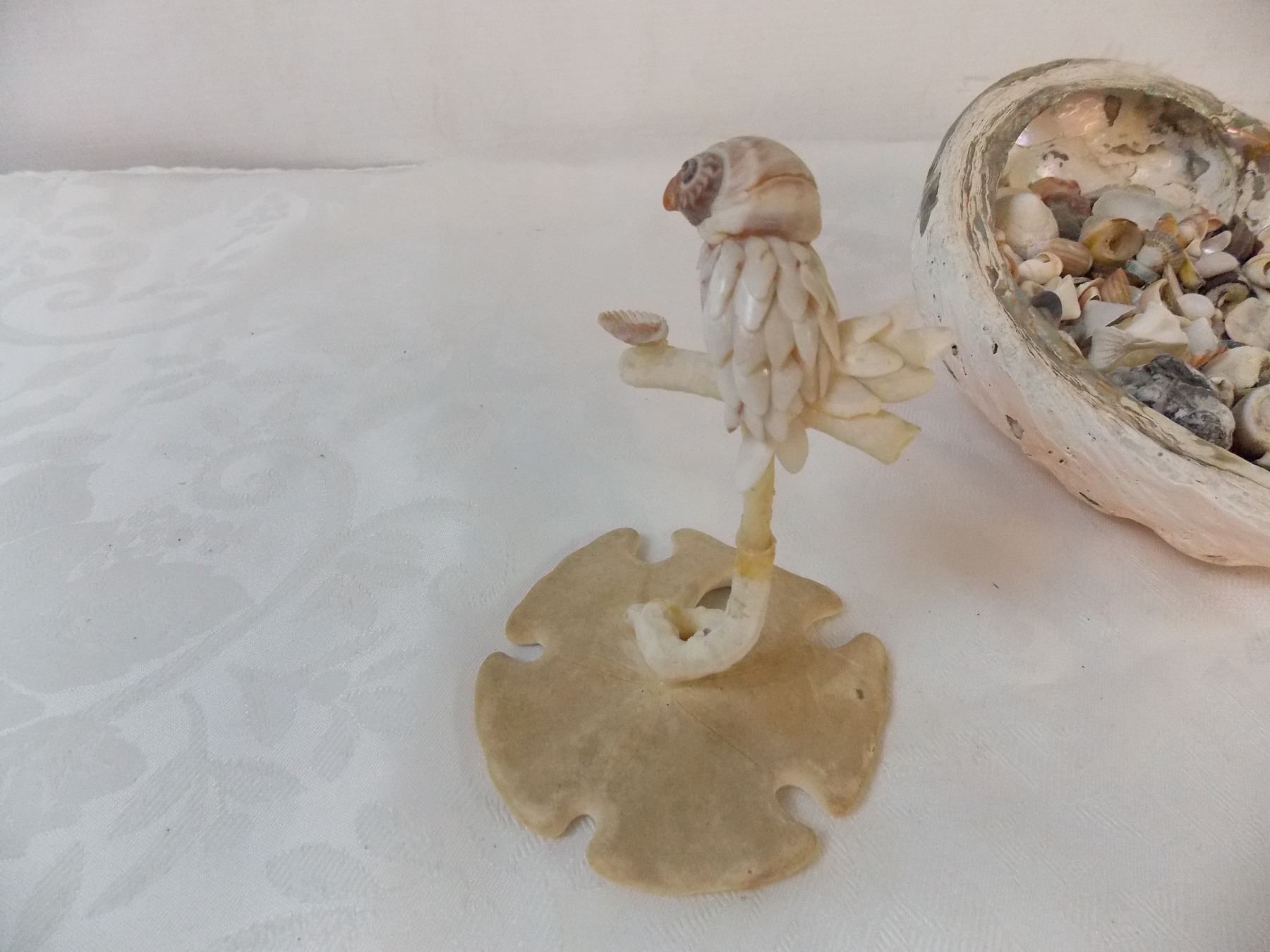 Large collection of small seashells, two starfish + handmade bird ornament from shells
