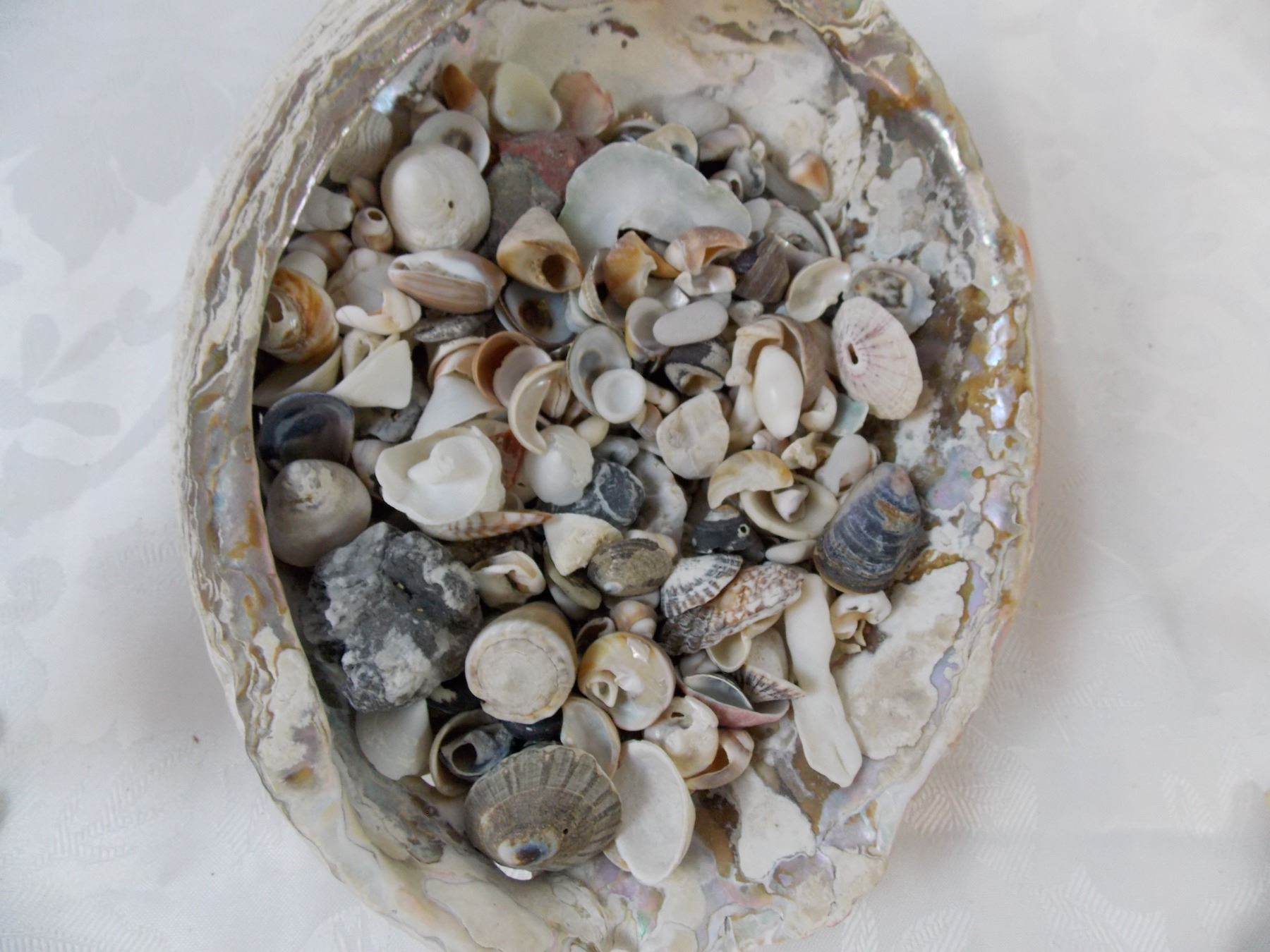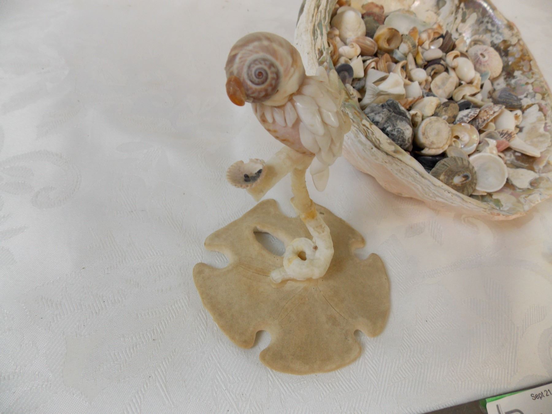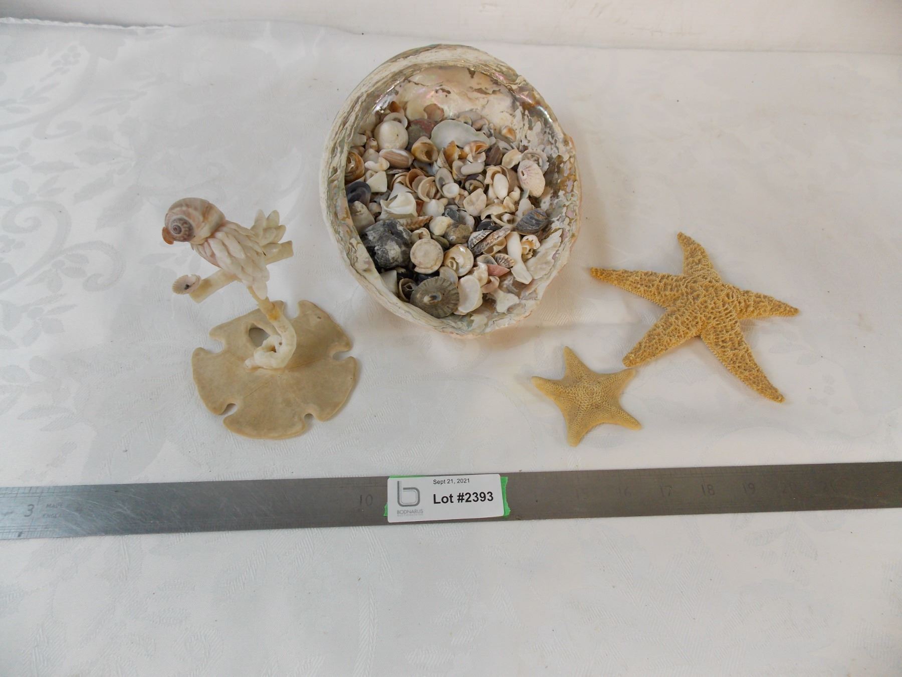Large collection of small seashells, two starfish + handmade bird ornament from shells