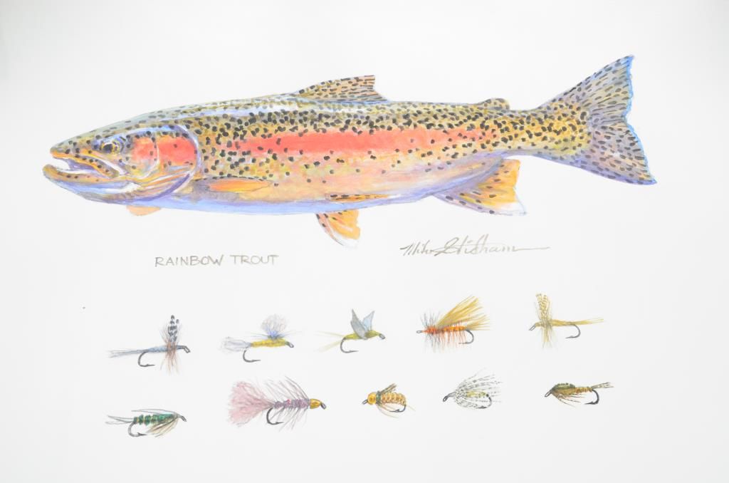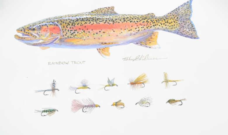 Large color print by wildlife artist Mike Stidham of a Rainbow Trout and ten hand-tied fishing flys on heavy rag paper approx. 22-1/2” x 30” overall; beautifully accomplished and ready for framing. Est.:$75-$125.