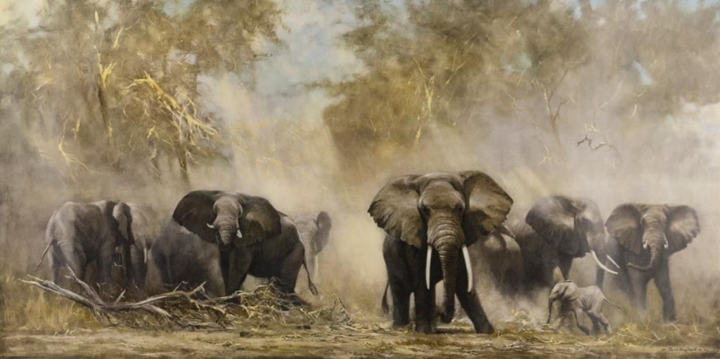 Large color print of elephants by noted wildlife artist David Shepherd, approx. 23” x 28” entitled “Elephants at Amboseli” (1962). Est.: $100-$150.