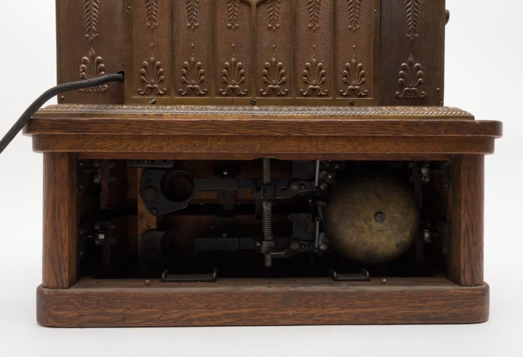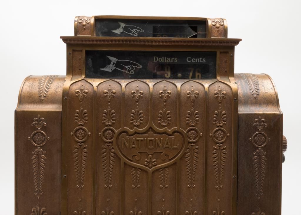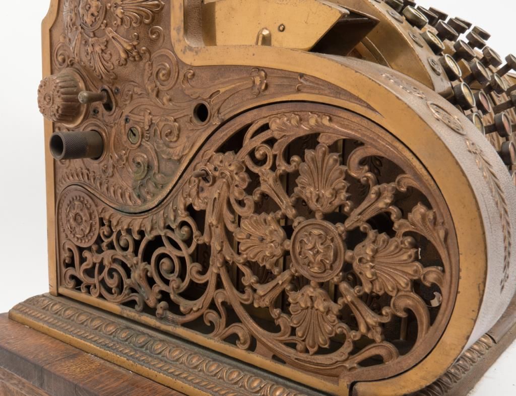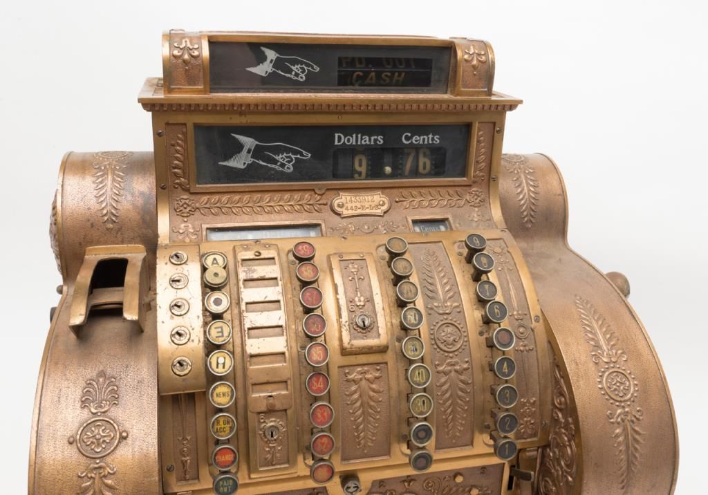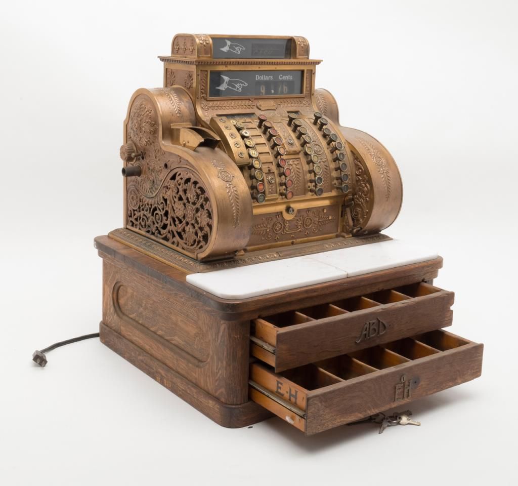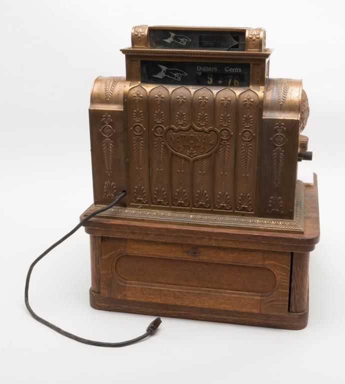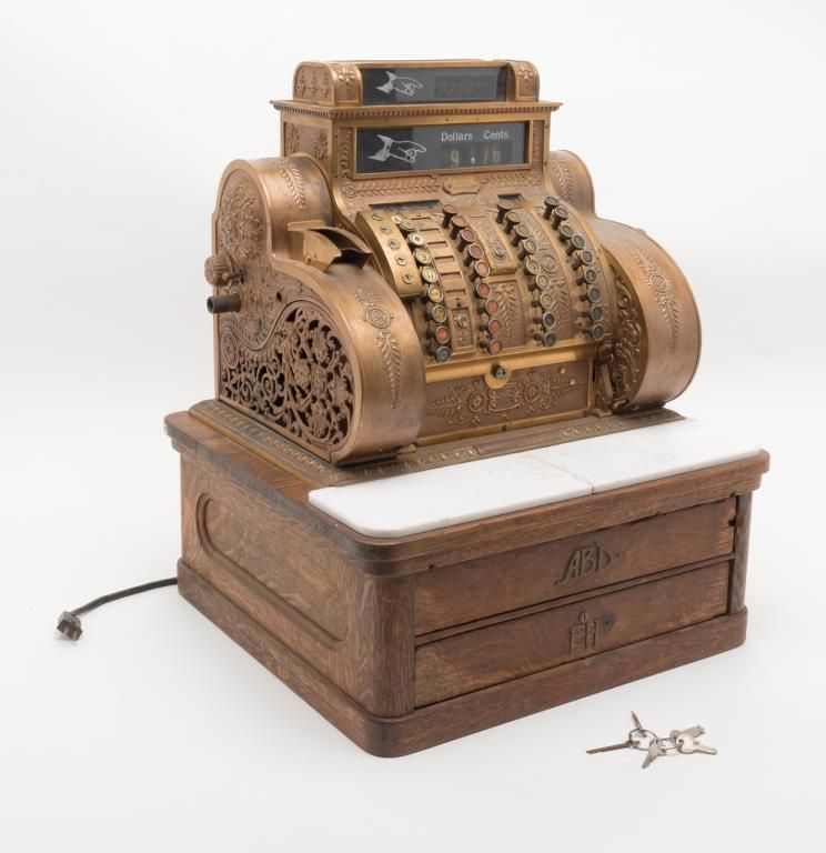 Large commercial size brass cash register, circa WW I, approx. 26” in height (including oak base with two drawers), 22” wide and 20” deep; crack handle broken off but present, missing top sign piece, cracked white marble deck piece;electrified; keys still with register; non-operational; ready for restoration. Est.: $250-$500.