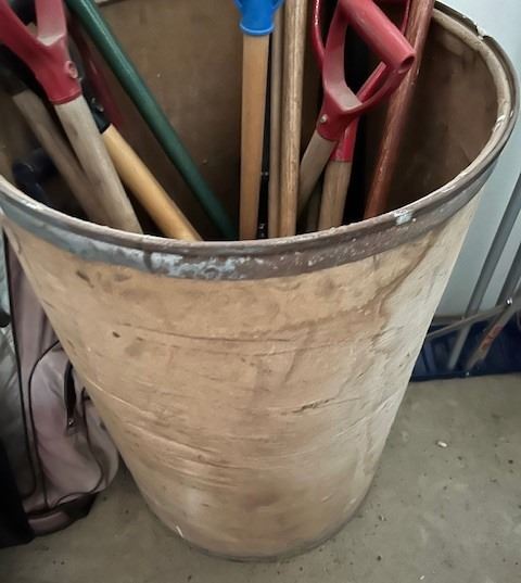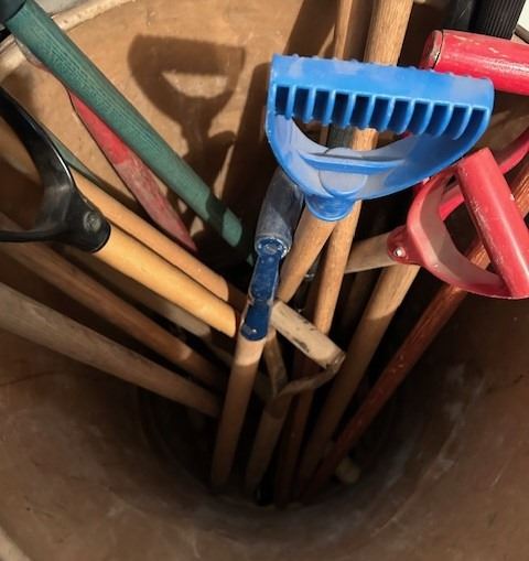 Large container with many shovel/broom handles - both used and new; plastic and wood
