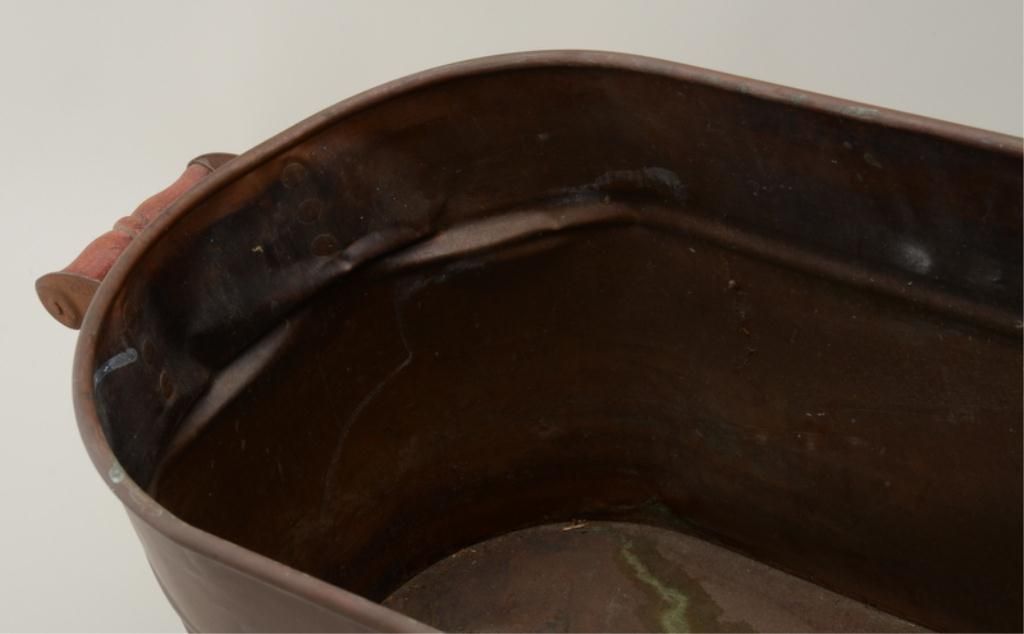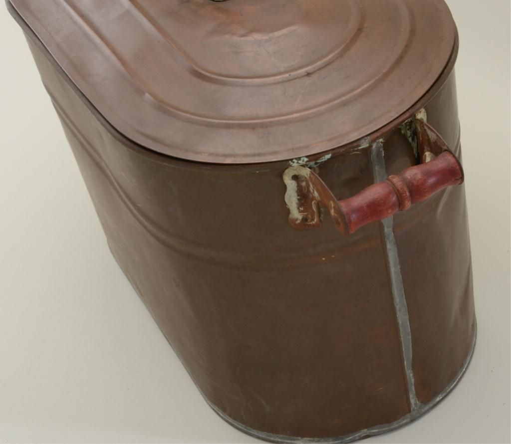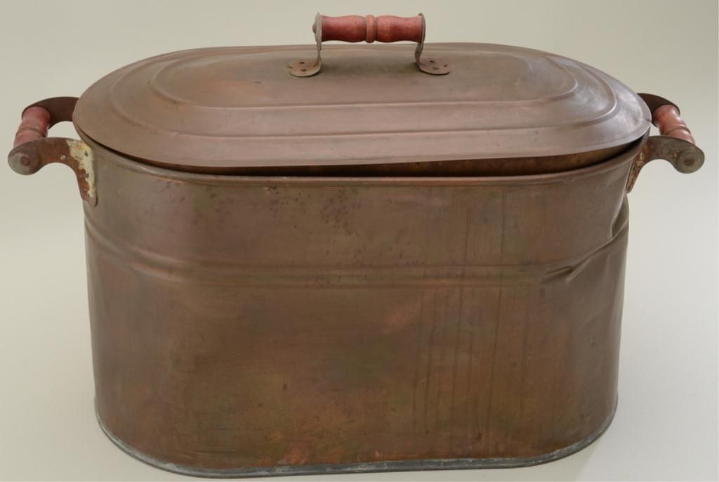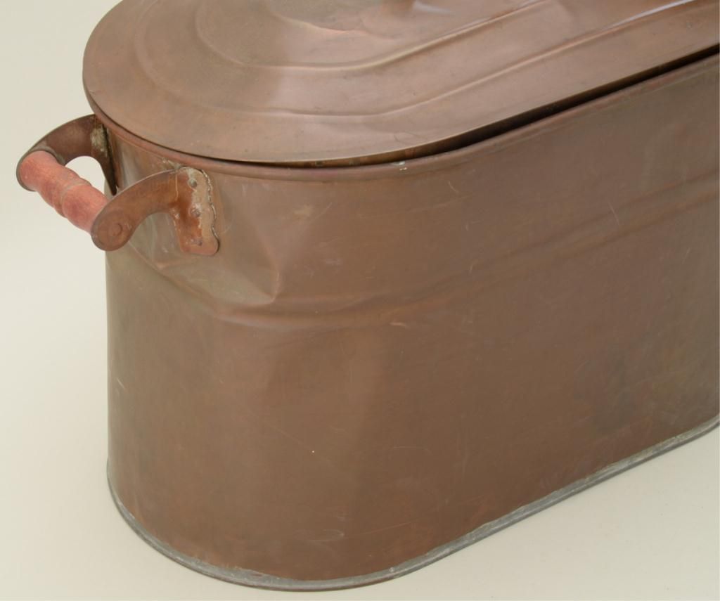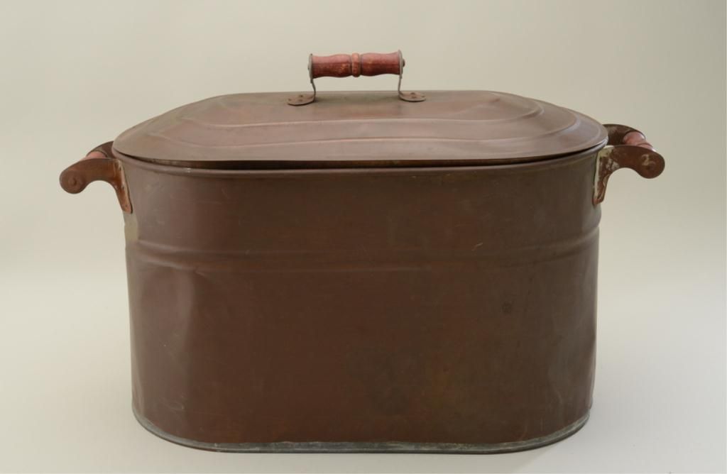 Large copper boiler pot with copper cover circa 1890’s in overall good condition showing a nice dark patina; approx. 24” long, 13” wide and 14” deep; a great decorator piece. Est.: $75-$150.