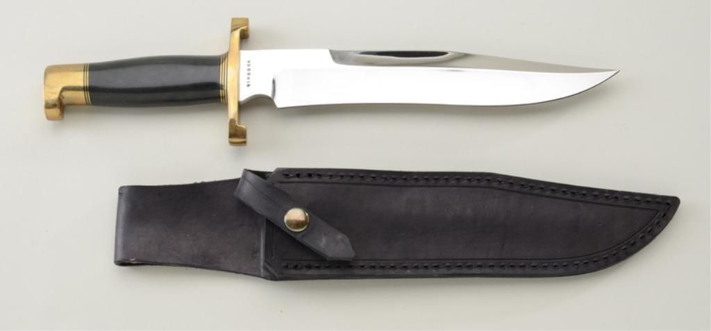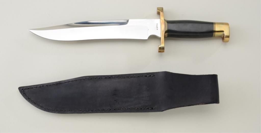 Large custom modern knife by Voorhis with leather sheath #4280 in like new condition approx. 15” overall with an approx. 10” blade. Est.: $400-$800.