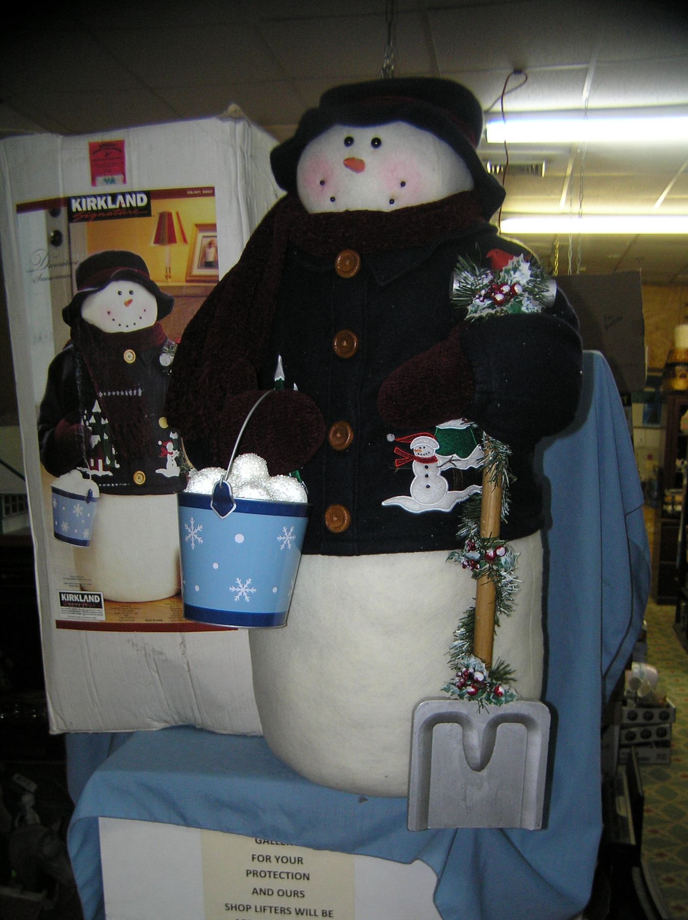 Large decorative snowman with shovel and bucket of snow balls, nicely dressed for winter 36 inches tall est. value 100.00-125.00