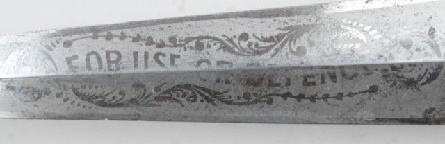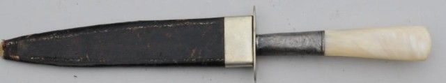Large dirk marked “Venture-Slater Brothers, Sheffield” with etched blade “For Use or Defense”; 6-1/2” blade, 11-1/4” overall; silver mounted with pearl grip; blade near fine with only slight aging and minor loss to very end of tip, slight pitting and beginning age; blade is finely ground and made; scabbard missing tip. From an old collection in Auburn, CA in the heart of the Gold Country. Est.: $600-$1,200.