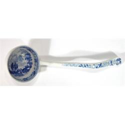 Large early 19th century Turner blue and white transfer printed Villager patterned pottery sauce ladle with floral handle, 31cm in length