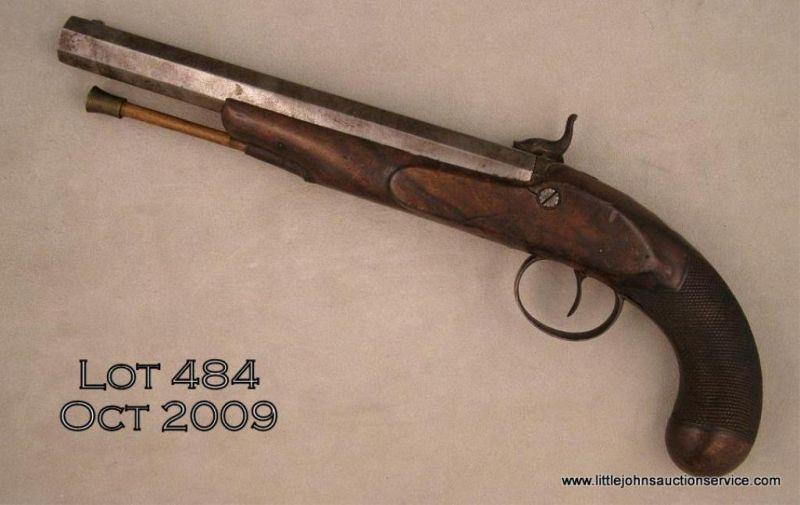 Large early 19th century officer's pistol converted from flintlock to percussion signed Howell and Simmons. The pistol measures 15" overall with 8 7/8" oct. bbl in approx. 69 cal. smoothbore. The stock has been reduced approx 4"from muzzle and was a full stock now slightly longer than half-stock (often stocks were altered when converted) The hammer is a forged American style as is the bolster and the conversion was in our opinion an American accomplishment. Thesilver plaque inlaid at wrist is engraved with initials P.B. in fancy script. The condition is fair to good with a large crack to stock near by, trigger guard, good metal with normal aging. A hickory ramrod with brass head which appearsAmerican is also included. From a Southern family which contended it was kept for dueling (just in case the family honor was insulted) The current descendent and consignor prefers a sig and figures the family honor went out the window when theymoved to California and became socialists in the 1930's. Est. $400 - $800
