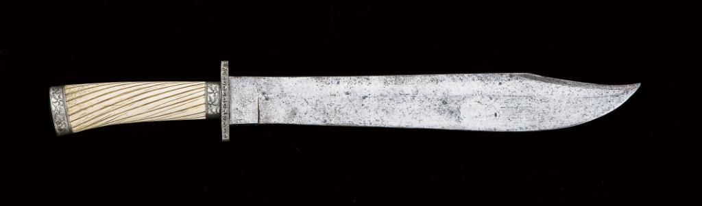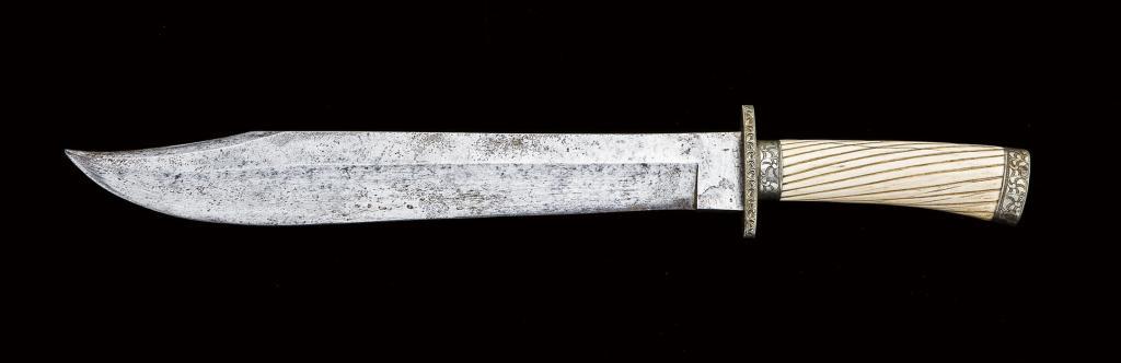 Large fancy unmarked Bowie knife, approx. 17-3/4” overall with 12-1/2” clip point blade with sharpened false edge. Blade is 1/4” stock. The hilt is made from one piece fluted bone with minor age cracks. The German silver mounts are all engraved including the front, back, and sides of the crossguard, the ferrule and the pommel cap. The blade is in excellent condition overall with light aged patina. Mid to late 19th Century. Hugh Hayes Collection. Est: $600 - $1,200