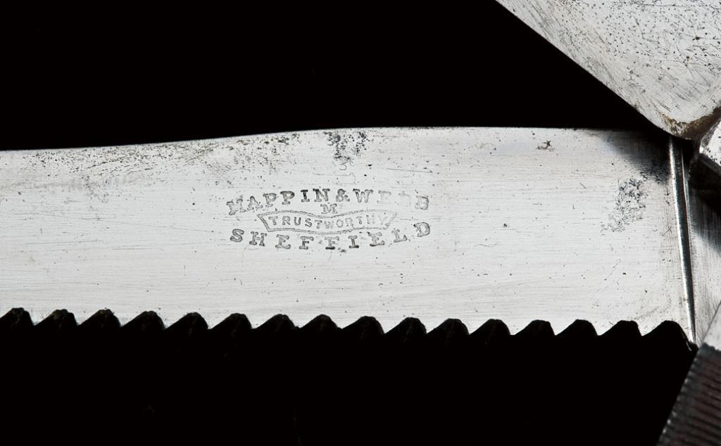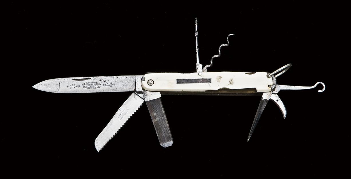 Large folding lockback sportsman’s knife by Mappin & Webb with 3 blades and a variety of instruments including a combination tweezer/lancet insert at one end of the grip and prick at the other. Also a scissors and a 12” three-piece measuring tape. Approx. 6-1/4” overall (closed). The master spearpoint lockback blade is 4-7/8” long and is etched with Mappin & Webb Sheffield logo and trademark. The blades include master lockback spearpoint, a saw blade, a file, a can opener, a button hook, an awl, a small pen blade, a fingernail file, a cork screw, and an auger. All of the blades snap properly. The master blade shows sharpening with full edge and tip. Thick ivory scales measure approx. 5/32” thick with German silver pins. The hilt has German silver tipped bolsters and a German silver bail. Ivory scales have an uninscribed silver escutcheon plate. Scales show hairline cracks and one 1/4" chip to the obverse side at the master pin. Circa approx. 1860’s-1870’s. Hugh Hayes Collection. Est.: $800 - $1,600.