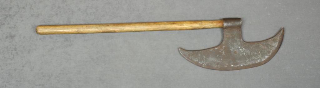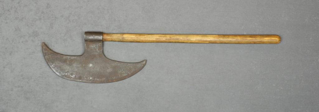 Large forged axe approx. 18” blade that is proofed with an oak shaft approx. 34” long; heavy dark patina to head. Est.: $150-$300.