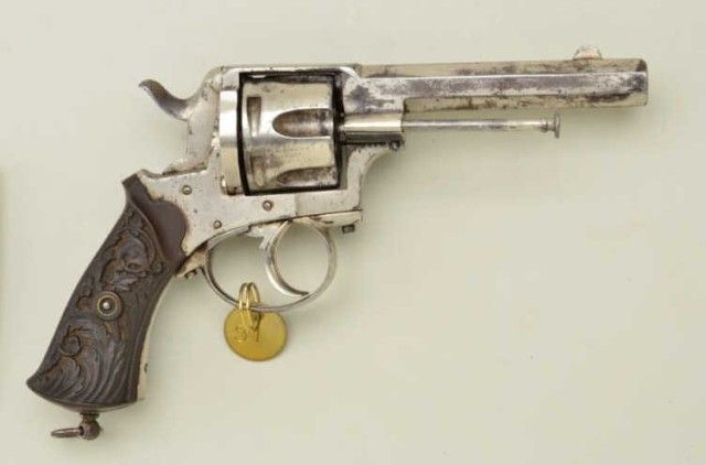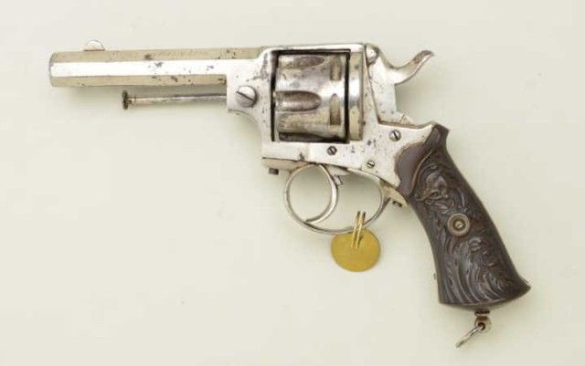 Large frame DA revolver marked “WESTERN STAR” on left top barrel flat, .44 cal., 4-1/2” octagon barrel, nickel finish, fancy cast black hard rubber grips, #NVSN. This gun is in overall good to very good conditionshowing approx. 65% original finish, good action, bore and markings, Belgian-proofed; ejector rod, lanyard ring, grips show stylized floral design with incorporated bird’s head design on each side at the top of the grips. Est.: $600-$1,200.