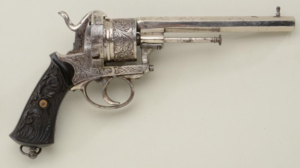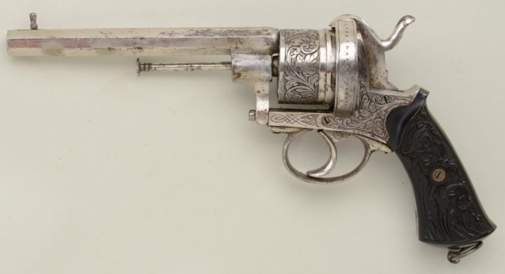 Large frame pinfire revolver, 11mm cal., 6” octagon barrel, engraved, nickel finish, fancy relief