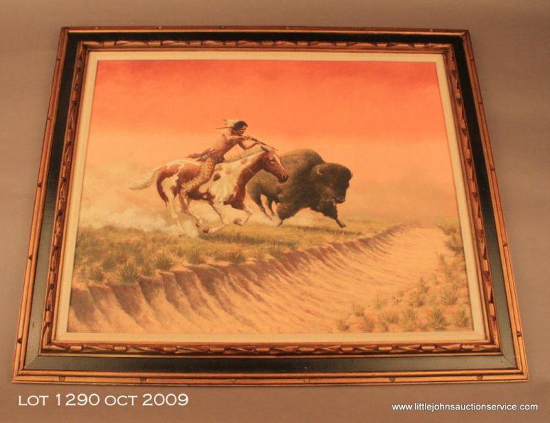 Large framed color painting on canvas of an Indian on horseback chasing a buffalo, by known Texas artist Don Bowlin entitled “Fresh Meat”, approx. 24” x 31” in fine condition showing nice coloring and action. Would be a great addition to the gunor hunting room. Est.: $500-$1,000.