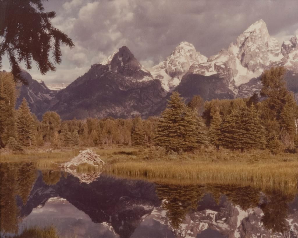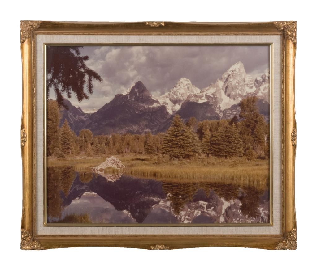 Large framed color photograph of snow capped mountains reflected in a tree-surrounded lake with beaver “lodge” in foreground; outstanding composition. Est.: $75-$150.