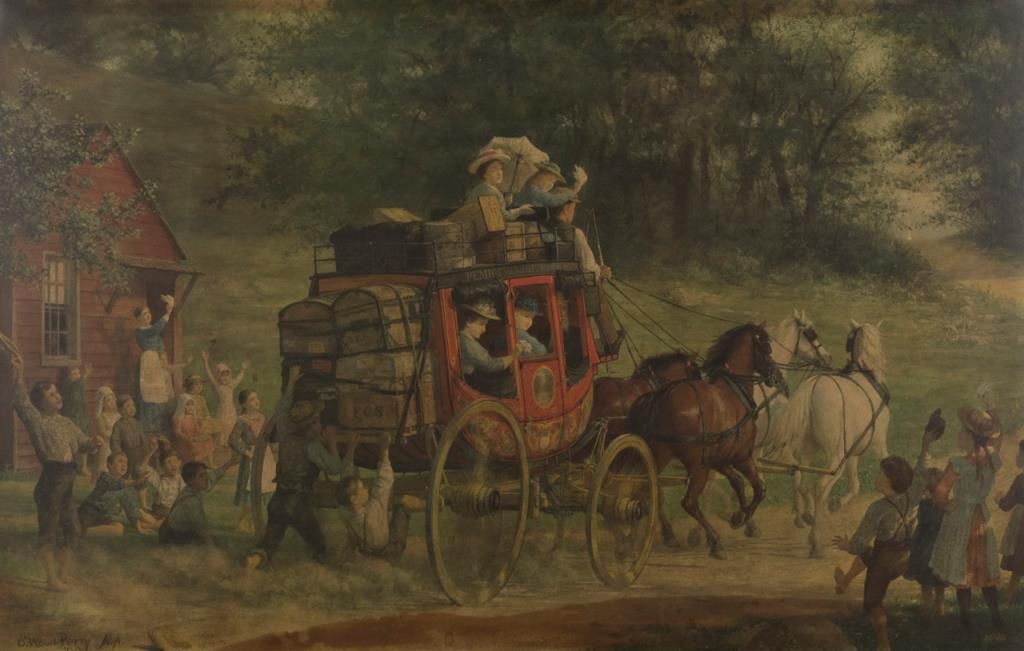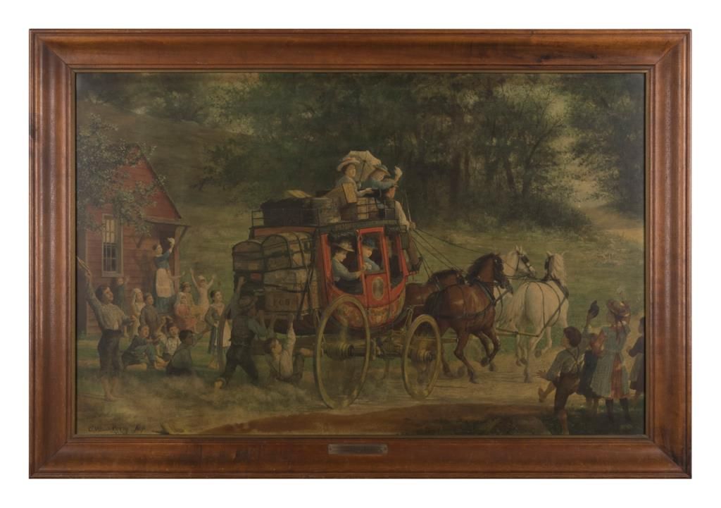 Large framed color print showing the horse drawn Pemigewasset Coach passing a little red school house, by Enoch Woud Perry, approx. 28” x 41” overall; in very good condition. Est.: $50-$100.