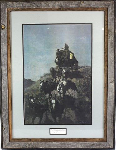of the Plains" by Frederic Remington, nicely matted with custom barnwood frame, 34" X 44". Est. 75-150