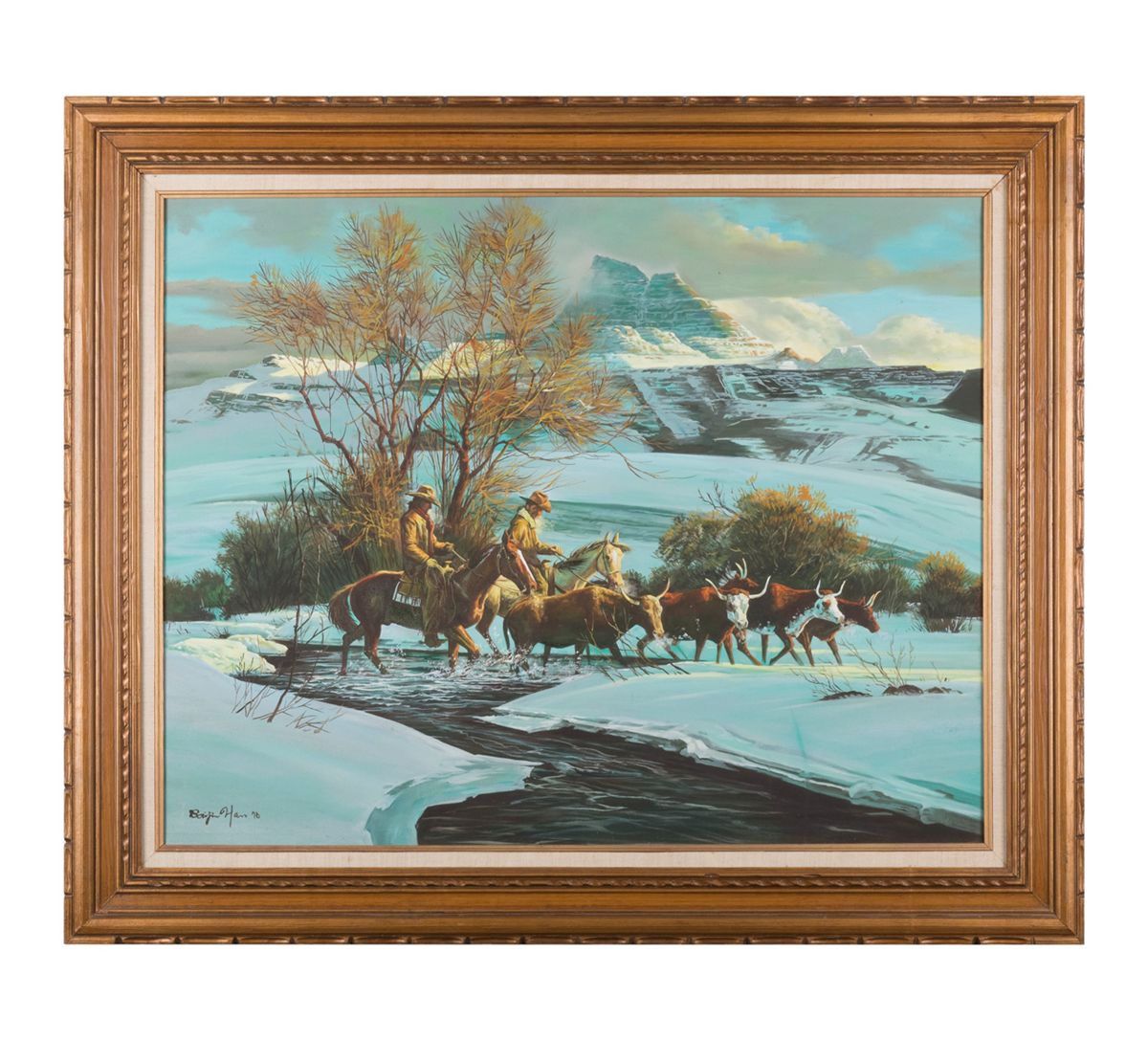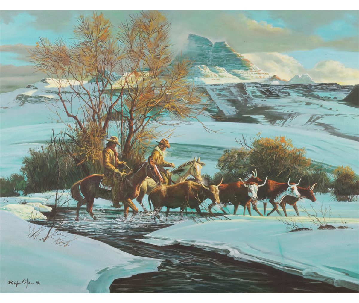 Large framed oil on canvas original painting of cowboys driving cattle in the winter near snow capped mountains, approx. 37” x 44”, signed Benjamin ’76; nicely accomplished. Est.: $300-$600.